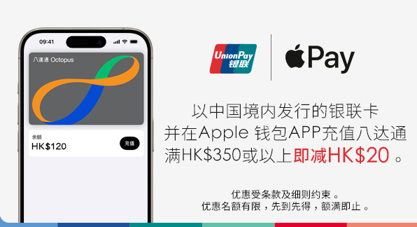 以中国境内发行的银联卡并在Apple 钱包APP充值八达通满HK$350或以上HK$20活动期间,单一用户最多可享受优惠1次,同一注册手机号,同一银行卡预留手机号,同一银行实体卡号等任一条件,均视为同一用户。优惠名额有限,先到先得,额满即止。