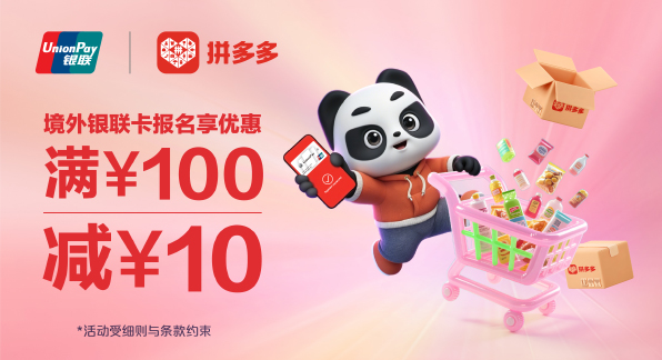 活动报名成功后,在拼多多APP消费时通过多多支付、云闪付或Apple Pay渠道使用已成功报名活动的银联卡支付,享受满100元立减10元优惠。