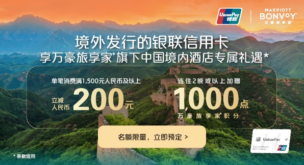 2、 中国境外(含港澳台地区)发行的银联信用卡持卡人通过万豪国际专属预定页,预定万豪国际集团旗下参与活动的酒店(具体酒店名单以专属预定页为准)。使用境外发行的银联信用卡进行担保预定并结算,满1500元可享200元立减优惠。对于连住2晚以上的万豪旅享家会员可享受额外1000点万豪旅享家积分奖励。活动期间酒店库存可能会发生变动。最终清单将根据实际执行情况确定。积分奖励适用范围:连住两晚及以上可享受的积分奖励,仅限通过万豪国际专属直销渠道完成预订的订单。以下通过直销渠道预订的特殊房价类型,不适用本积分奖励:万豪集团员工价及相关员工福利房价;纯积分兑换房价、积分与现金组合兑换房价;企业协议房价、公司专属房价等。本积分活动不与其他万豪旅享家积分奖励活动同时适用,亦不叠加奖励。