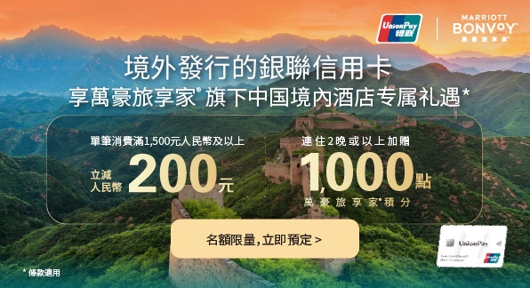 2、中國境外(含港澳臺地區)發行的銀聯信用卡持卡人通過萬豪國際專屬預定頁,預定萬豪國際集團旗下參與活動的酒店(具體酒店名單以專屬預定頁為準)。使用境外發行的銀聯信用卡進行擔保預定並結算,滿1,500元可享200元立減優惠。對於連住2晚以上的萬豪旅享家會員可享受額外1,000點萬豪旅享家積分獎勵。活動期間酒店庫存可能會發生變動。最終清單將根據實際執行情況確定。連住兩晚及以上可享受的積分獎勵,僅限通過萬豪國際專屬直銷渠道完成預訂的訂單。以下通過直銷渠道預訂的特殊房價類型,不適用本積分獎勵:萬豪集團員工價及相關員工福利房價;純積分兌換房價、積分與現金組合兌換房價;企業協議房價、公司專屬房價等。本積分活動不與其他萬豪旅享家積分獎勵活動同時適用,亦不疊加獎勵。