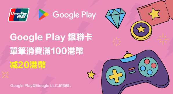 • Google Play銀聯卡單筆消費滿100港幣享20港幣回贈