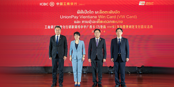 11月4日,银联国际与中国工商银行万象分行联合宣布,在老挝首次推出银联锦绣中华广西主题卡,旨在为老挝居民日常消费和来华旅行提供便捷、安全的支付服务。中国驻老挝大使方虹、老挝中央银行副行长阿伦·本永、中国银联总裁郭大勇、中国工商银行万象分行行长沈学勤出席发卡仪式。