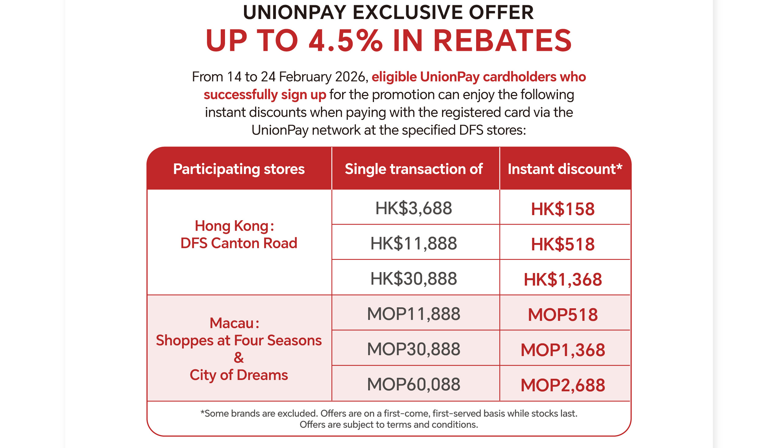 The specific participating brands are subject to in-store displays. As permitted by applicable law, brands decide their own participation in the promotion, and have the final right to withdraw from the promotion during the promotional period. DFS will not bear responsibility for the withdrawal of any brand from the promotion.- All consignment sale brands - Fashion:Charles & Keith - Tobacco and Alcohol: Cigarettes/Cigars, Fine Wines, and Spirits. - A total of no less than 800 quotas for Promotion in HK and Macau will be distributed on a first-come, first-served basis. After successful registration, please check the remaining quotas on the registration page before payment. The promotion will end once all quotas are fully redeemed. Successful registration does not guarantee securing a discount quota.