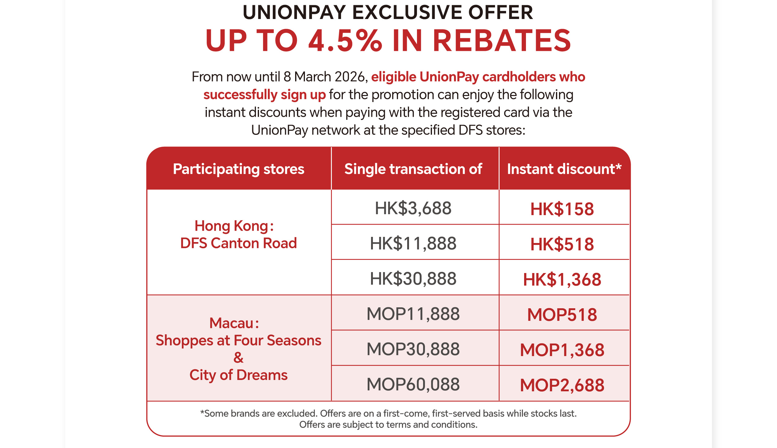 The specific participating brands are subject to in-store displays. As permitted by applicable law, brands decide their own participation in the promotion, and have the final right to withdraw from the promotion during the promotional period. DFS will not bear responsibility for the withdrawal of any brand from the promotion.- All consignment sale brands - Fashion:Charles & Keith - Tobacco and Alcohol: Cigarettes/Cigars, Fine Wines, and Spirits. - A total of no less than 100 quotas for Promotion in HK and Macau will be distributed on a first-come, first-served basis. After successful registration, please check the remaining quotas on the registration page before payment. The promotion will end once all quotas are fully redeemed. Successful registration does not guarantee securing a discount quota.