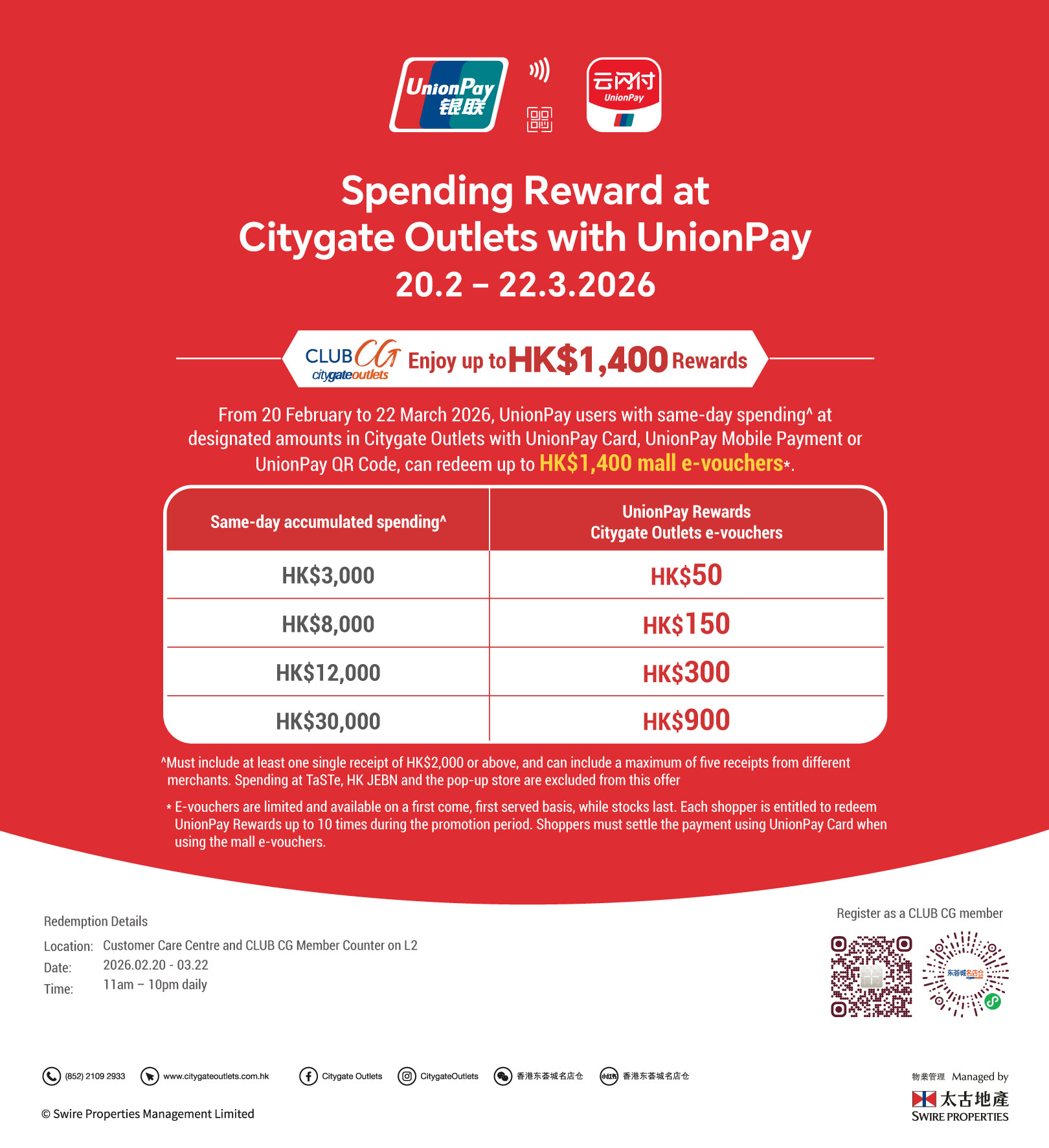 - From 20 February to 22 March 2026, CLUB CG members who spend via designated UnionPay payment on the same day at Citygate Outlets with: