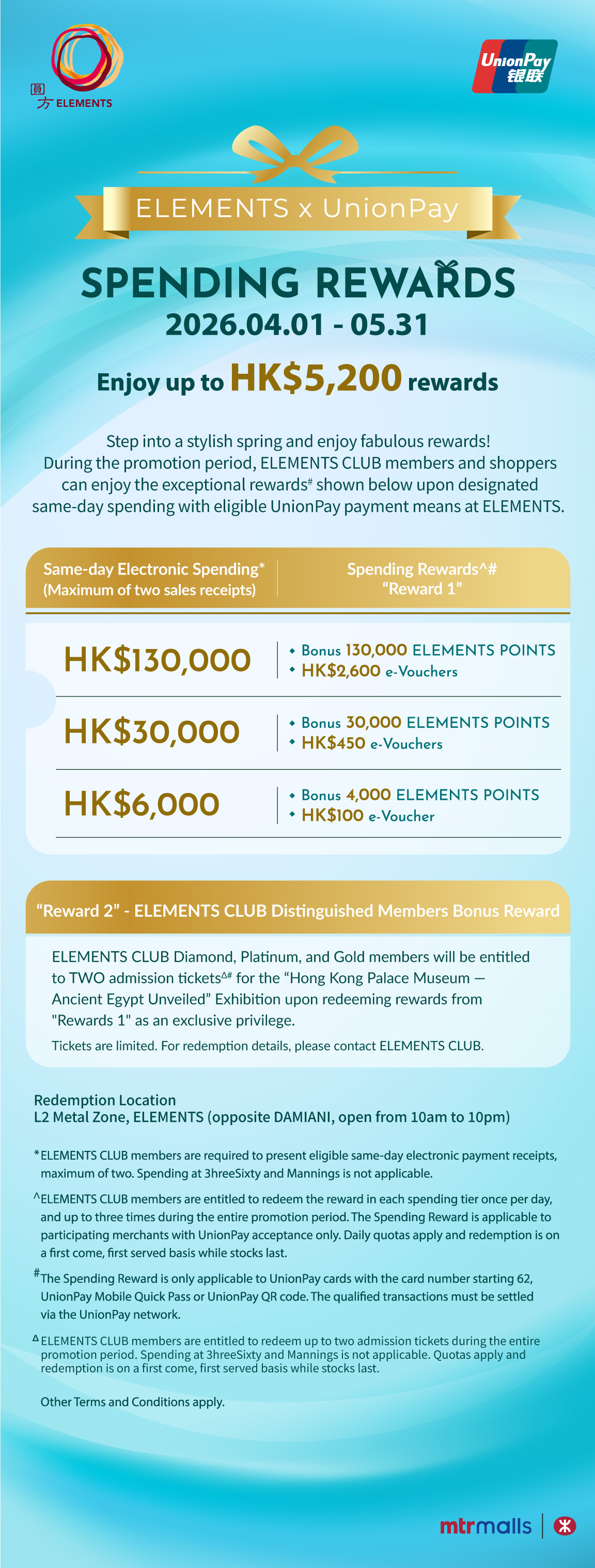 - ELEMENTS CLUB members are entitled to redeem the Reward in each spending tier of “Reward 1” once per day, and up to three times during the entire promotion period. For “Reward 2”, ELEMENTS CLUB members are entitled to redeem up to two admission tickets for the “Hong Kong Palace Museum — Ancient Egypt Unveiled” Exhibition during the entire promotion period. The rewards are applicable to participating merchants with UnionPay acceptance only. Daily quotas apply and redemption is on a first come, first served basis while stocks last.