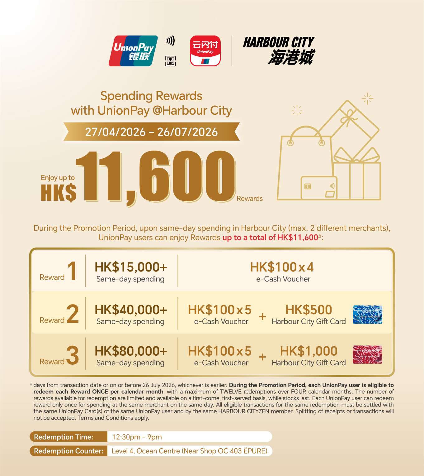 - Spending Reward with UnionPay @Harbour City (refers to the “Promotion”) is valid from 27 April to 26 July 2026, both dates inclusive (refers to “Promotion Period”).