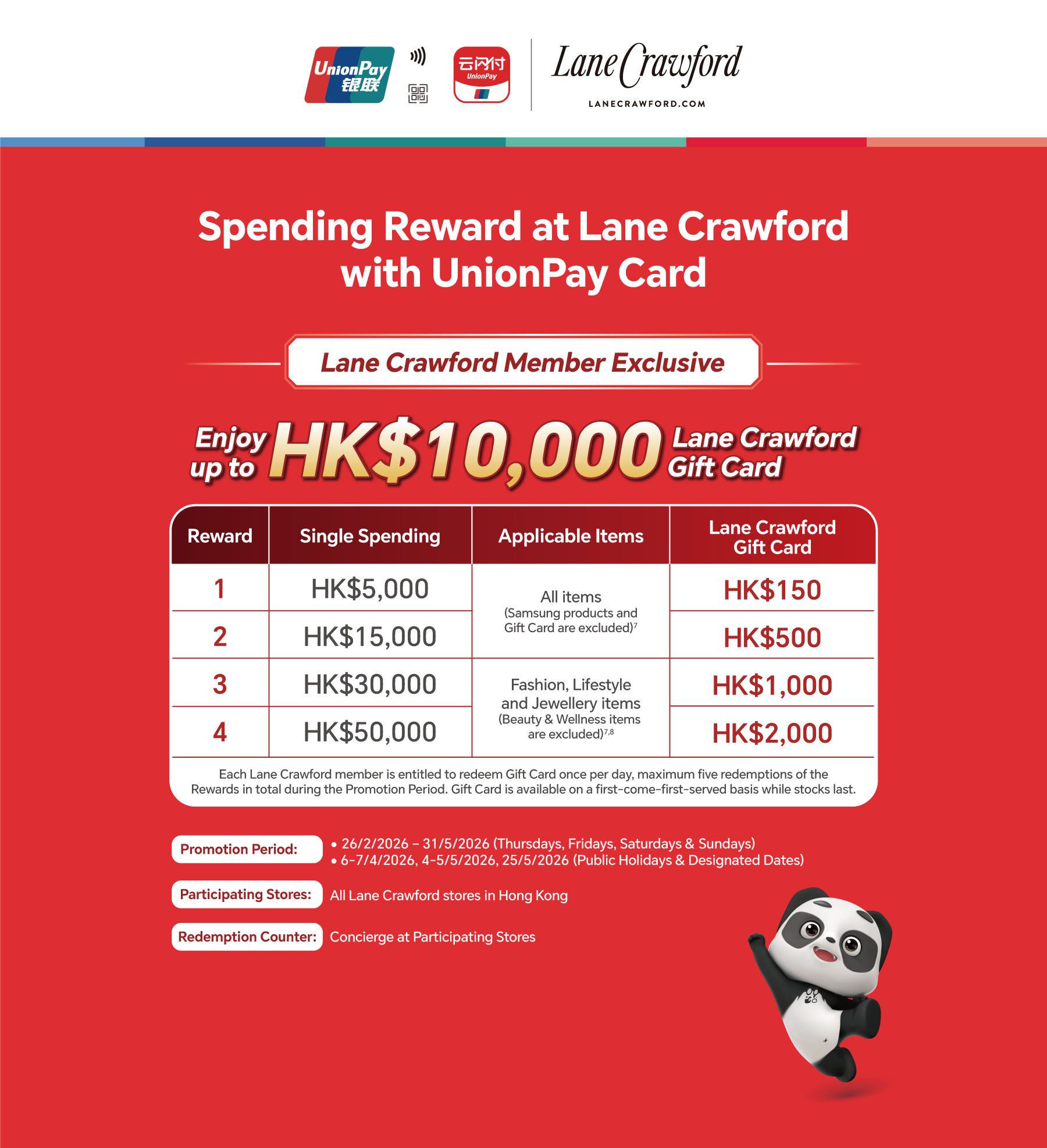 - Cardholders must register as Lane Crawford member to enjoy the Promotion.
