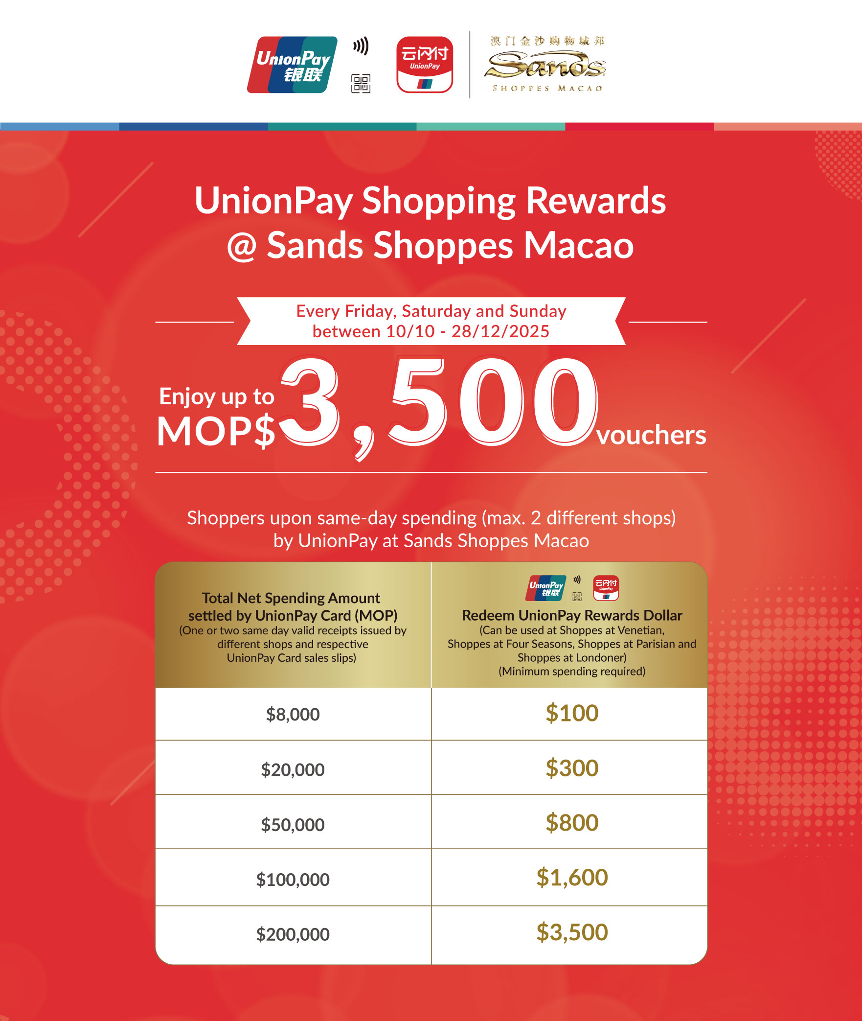 (MOP500 Rewards Dollar x 7pcs)b. Shoppers must present the valid Shops receipt / merchant sales invoice, respective UnionPay Card or transaction record(s) of UnionPay Mobile Payment, and UnionPay Card sales slip(s) of respective spending for redeeming the Rewards Dollar. The transaction date shown on the UnionPay Card sales slip(s) or transaction record(s) of UnionPay Mobile Payment must be within the Term of the Campaign. c. The transaction amount shown on the UnionPay Card sales slip(s) or transaction record(s) of UnionPay Mobile Payment must be the same or lower than that on the corresponding Shops receipts / merchant sales invoices. However, the total transaction amount on eligible UnionPay Card sales slip(s) or transaction record(s) of UnionPay Mobile Payment should meet the required Total Net Spending Amount under clause 5a in order to redeem the Rewards Dollar. UnionPay Card sales slip(s) or transaction record(s) of UnionPay Mobile Payment with a single transaction amount exceeding MOP499,999.99 will not be accepted to redeem the Rewards Dollar. d. All UnionPay Card or UnionPay Mobile Payment transactions via the UnionPay network under one receipt / merchant sales invoice shall be considered as a single UnionPay Card or UnionPay Mobile Payment transaction. The original copy of machine-printed Shops receipt / merchant sales invoice should clearly state the merchant name, transaction date, transaction amount and purchased products. The original copy of UnionPay Card sales slip or transaction record of UnionPay Mobile Payment should clearly indicate the UnionPay Card card number, merchant name, transaction date, transaction amount, valid authorization code and signature of Cardholders (if applicable). If Shopper cannot present the valid original copies of Shops receipt / merchant sales invoice, UnionPay Card sales slip(s) or transaction record(s) of UnionPay Mobile Payment, UnionPay Card with consistent information including UnionPay Card card number, merchant name, transaction date, transaction amount, etc., or the information provided by Shopper is insufficient, Shopper will not be able to redeem the Rewards Dollar for any reason. e. UnionPay Card sales slip(s) or transaction record(s) of UnionPay Mobile Payment and Shops receipts / merchant sales invoices that are damaged, outdated and unable to show clearly the transaction dates, time, amounts, currencies or without showing any card numbers are not acceptable. f. Each Shopper is limited to a maximum of 20 redemptions (regardless of the value) throughout the Term of the Campaign. g. The Rewards Dollar are available on a “first come, first served” basis, while stocks last. h. The Rewards Dollar cannot be redeemed for cash, changed or exchanged for other items. i. Lost, stolen or damaged Rewards Dollar cannot be reclaimed, refunded or replaced. j. The Campaign cannot be redeemed in conjunction with other campaigns and/or privileges (with exception to Sands Shoppes Macao's “Discover Sands Shoppes” Program). - Spending at Sands Shoppes Macao: