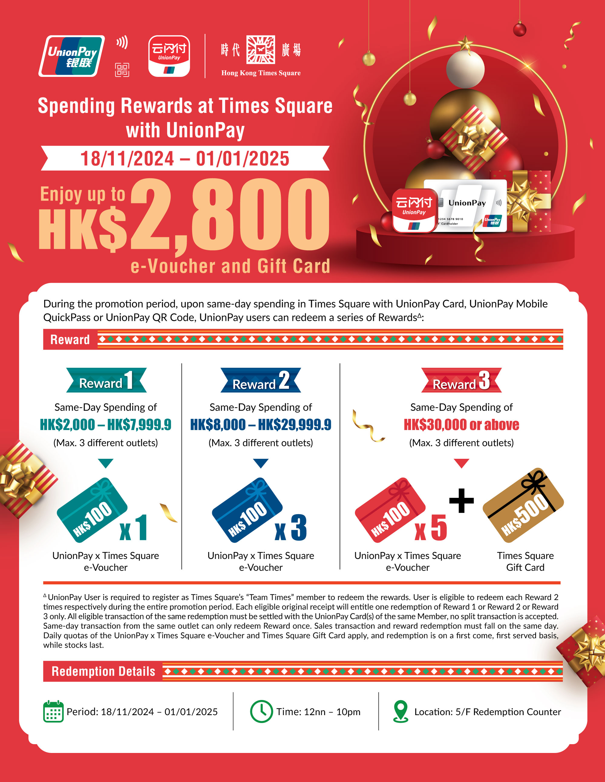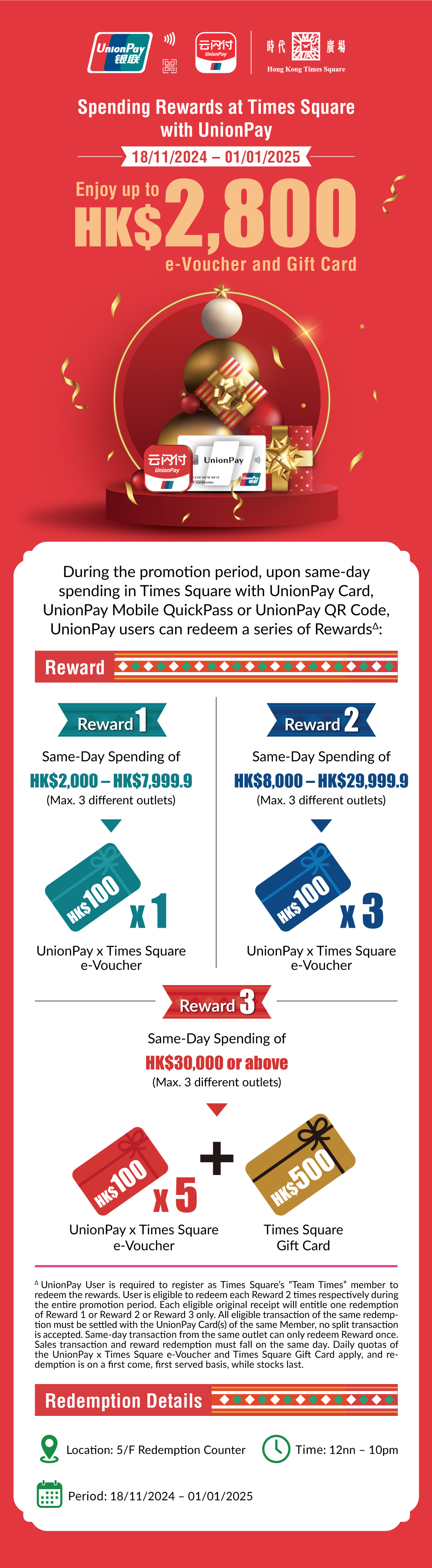 - "Enjoy up to HK$2,800 Cash e-Vouchers and Gift Card" is calculated based on spending HK$2,000 – HK$7,999.9 at any merchants for 2 times redemption of 1 piece of HK$100 UnionPay x Times Square e-Voucher (total value HK$200), spending HK$8,000 – HK$29,999.9 at any merchants for 2 times redemption of 3 pieces of HK$100 UnionPay x Times Square e-Voucher (total value HK$600), and spending HK$30,000 or above at any merchants for 2 times redemption of a HK$500 Times Square Gift Card and 5 pieces of HK$100 UnionPay x Times Square e-Voucher (total value HK$2,000) during the Promotion Period.