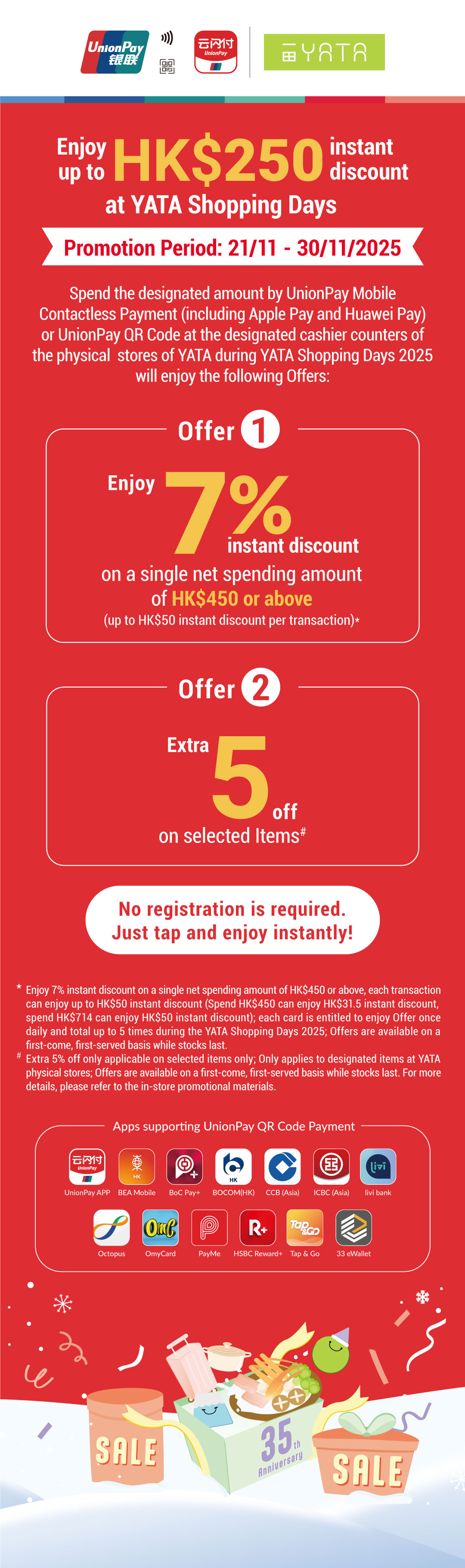 Extra 5% off only applicable on selected items only ; Offer 2 applies to designated items at YATA physical stores ; Limited quantities available while stocks last; For more details, please refer to the in-store promotional materials. (Offer 1 and 2 are hereinafter referred to as “Offers”) - Offers are applicable to payments made via UnionPay Mobile QuickPass (including but not limited to Apple Pay, Huawei Pay, etc.) or UnionPay QR Code payment (including UnionPay App and other apps supporting UnionPay QR Code). To be eligible for the Offer, the full transaction amount must be settled via the UnionPay network (excluding payment methods such as WeChat Pay and Alipay ).