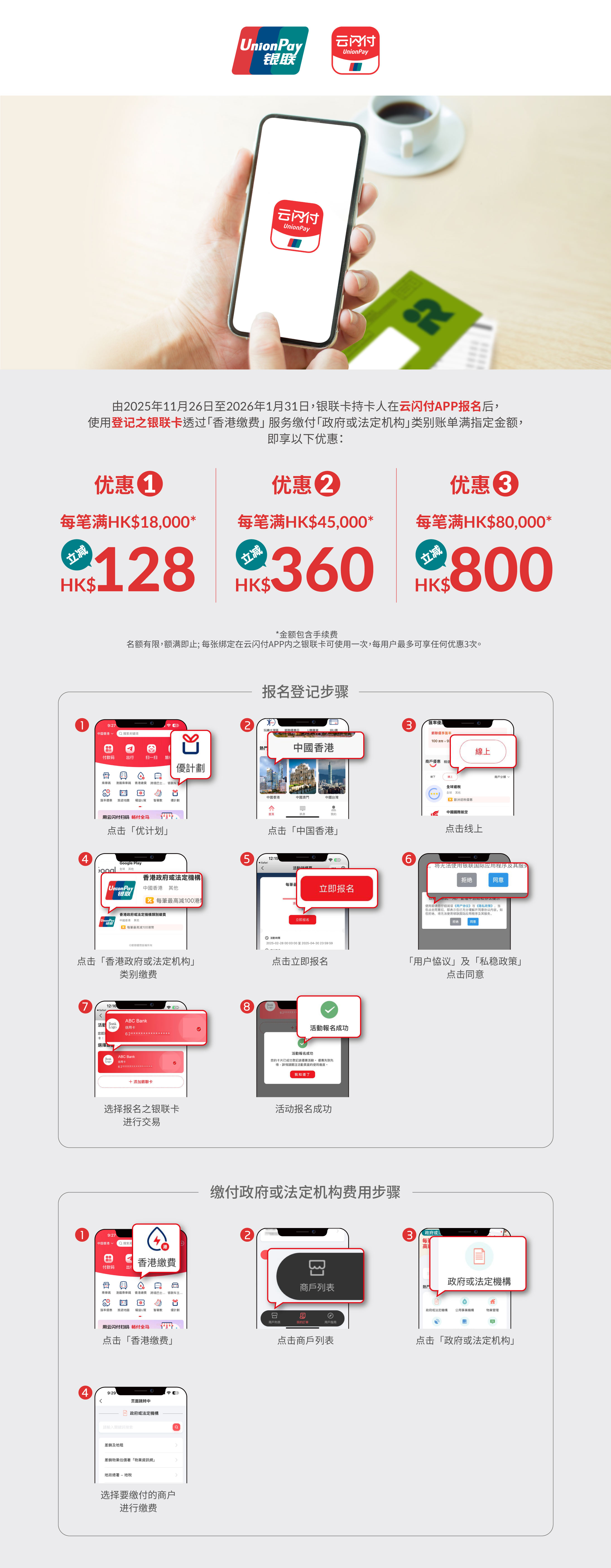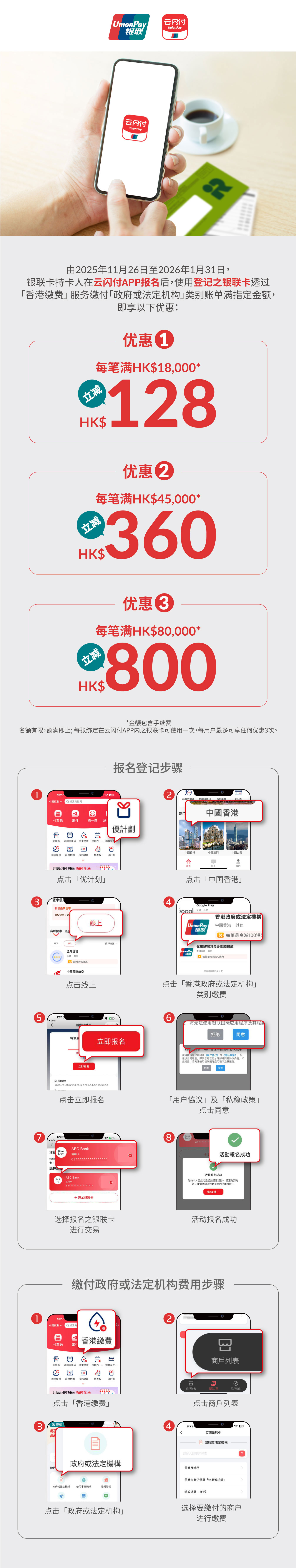 - 银联卡持卡人在云闪付APP成功报名后,使用合资格银联卡在云闪付APP(中国香港页面)/香港缴费/商户列表内政府或法定机构类别缴费满指定金额,即享以下即减优惠