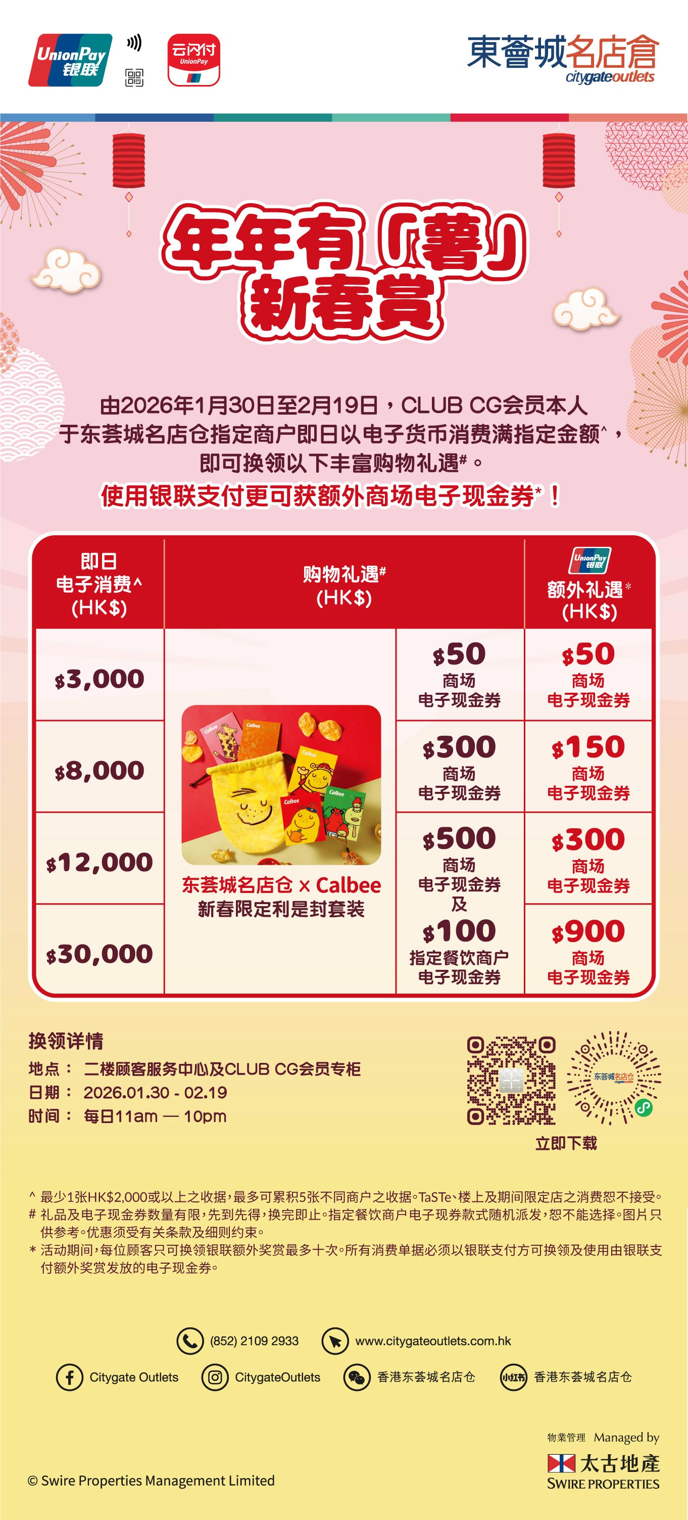 i. 港币3,000元至港币7,999 元 (最少一张港币2,000元或以上之收据,最多可累积5张不同商户之收据) ,即可换领东荟城名店仓 x Calbee新春限定利是封套装乙套及港币50元东荟城名店仓商场电子现金券;以指定银联支付方式消费,更可额外获得港币50元东荟城名店仓商场电子现金券; ii. 港币8,000元至港币11,999 元 (最少一张港币2,000元或以上之收据,最多可累积5张不同商户之收据),即可换领东荟城名店仓 x Calbee新春限定利是封套装乙套及港币300元东荟城名店仓电子现金券;以指定银联支付方式消费,更可额外获得港币150元东荟城名店仓电子现金券; iii. 港币12,000元或以上 (最少一张港币2,000元或以上之收据,最多可累积5张不同商户之收据),即可换领东荟城名店仓 x Calbee新春限定利是封套装乙套、港币500元东荟城名店仓电子现金券及港币100元指定餐饮商户电子现金券;以指定银联支付方式消费,更可额外获得港币300元东荟城名店仓电子现金券。 iv. 港币30,000元或以上 (最少一张港币2,000元或以上之收据,最多可累积5张不同商户之收据) ,即可换领东荟城名店仓 x Calbee新春限定利是封套装乙套、港币500元指定商户电子现金券及港币100元指定餐饮商户电子现金券;以指定银联支付方式消费,更可额外获得港币900元东荟城名店仓电子现金券。 - 每人每日最多只可换领以上任何一款礼遇各一次。活动期间,每位顾客只可换领银联额外奖赏最多十次。所有消费单据必须以银联支付方可换领及使用有银联支付额外奖赏发放的电子现金券。