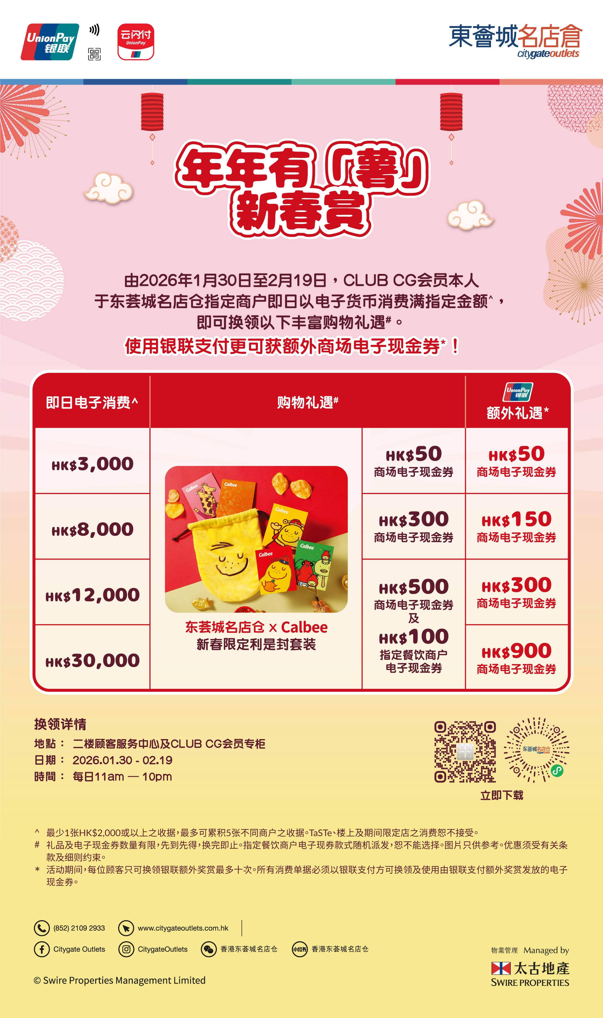 - 由2026年1月30日至2月19日,CLUB CG会员凡于东荟城名店仓以电子货币即日消费满
