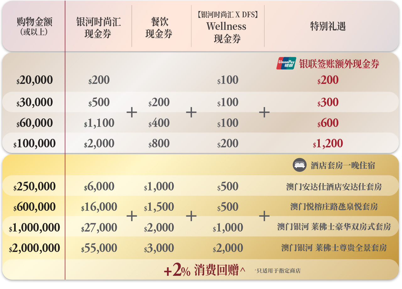 5.1.1. 单一张或两张由两间不同的指定零售商店即日发出的收据合计消费满澳门元/港元20,000至澳门元/港元29,999,可换领银河时尚汇现金券价值澳门元200及【银河时尚汇X DFS】Wellness现金券价值澳门元100; 5.1.2. 单一张或两张由两间不同的指定零售商店即日发出的收据合计消费满澳门元/港元30,000至澳门元/港元59,999,可换领银河时尚汇现金券价值澳门元500丶餐饮现金券价值澳门元200及【银河时尚汇X DFS】Wellness现金券价值澳门元100; 5.1.3. 单一张或两张由两间不同的指定零售商店即日发出的收据合计消费满澳门元/港元60,000至澳门元/港元99,999,可换领银河时尚汇现金券价值澳门元1,100丶餐饮现金券价值澳门元400及【银河时尚汇X DFS】Wellness现金券价值澳门元100; 5.1.4. 单一张或两张由两间不同的指定零售商店即日发出的收据合计消费满澳门元/港元100,000至澳门元/港元249,999,可换领银河时尚汇现金券价值澳门元2,000丶餐饮现金券价值澳门元800及【银河时尚汇X DFS】Wellness现金券价值澳门元200; 5.1.5. 单一张或两张由两间不同的指定零售商店即日发出的收据合计消费满澳门元/港元250,000至澳门元/港元599,999,可换领银河时尚汇现金券价值澳门元6,000丶餐饮现金券价值澳门元1,000丶【银河时尚汇X DFS】Wellness现金券价值澳门元500及澳门安达仕酒店 安达仕套房一晚的礼券; 5.1.6. 单一张或两张由两间不同的指定零售商店即日发出的收据合计消费满澳门元/港元600,000至澳门元/港元999,999,可换领银河时尚汇现金券价值澳门元16,000丶餐饮现金券价值澳门元1,500丶【银河时尚汇X DFS】Wellness现金券价值澳门元500及澳门悦榕庄路氹泉悦套房一晚的礼券; 5.1.7. 单一张或两张由两间不同的指定零售商店即日发出的收据合计消费满澳门元/港元1,000,000至澳门元/港元1,999,999,可换领银河时尚汇现金券价值澳门元27,000丶餐饮现金券价值澳门元2,000丶【银河时尚汇X DFS】Wellness现金券价值澳门元1,000及澳门银河 莱佛士豪华双房式套房一晚的礼券; 5.1.8. 单一张或两张由两间不同的指定零售商店即日发出的收据合计消费满澳门元/港元2,000,000或以上,可换领银河时尚汇现金券价值澳门元55,000丶餐饮现金券价值澳门元3,000丶【银河时尚汇X DFS】Wellness现金券价值澳门元2,000及澳门银河 莱佛士尊贵全景套房一晚的礼券。 - 活动期间,任何合资格之银联用户使用卡号以62开头的银联信用卡及借记卡(下称「银联卡」)** 或使用云闪付App 成功通过银联网路在「澳门银河」银河时尚汇指定零售商店(请参考附页一)于同日消费合计满以下条款6.1.1至6.1.4所述的购物金额,即可凭该指定零售商店即日发出的单一张收据或由两间不同的指定零售商店即日发出的最多两张收据*(每间零售商户仅限收据乙张)换领以下由银联国际有限公司(下称「银联国际」)赞助之银联购物现金券: