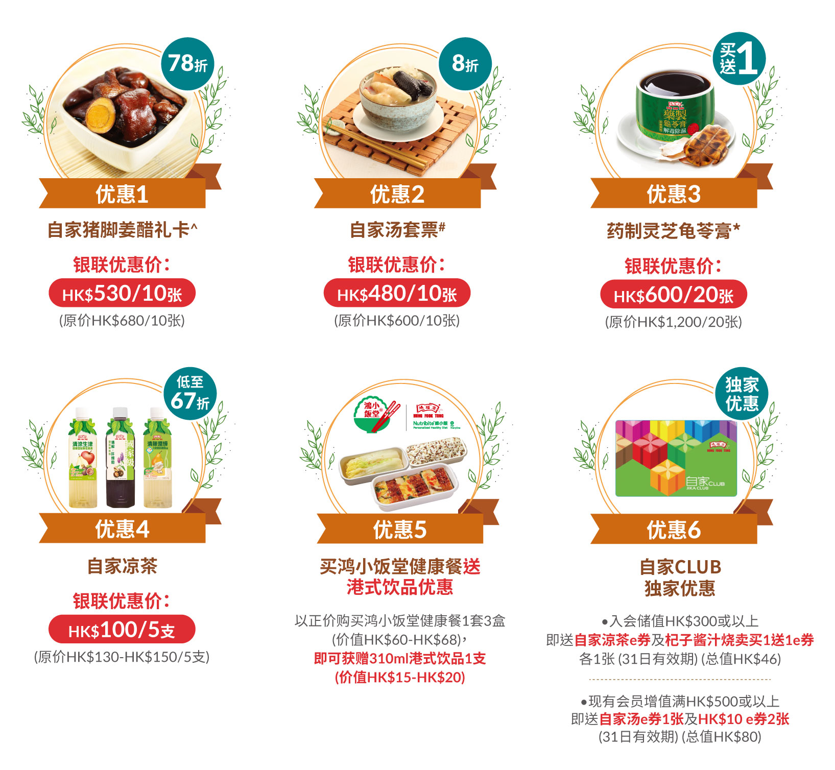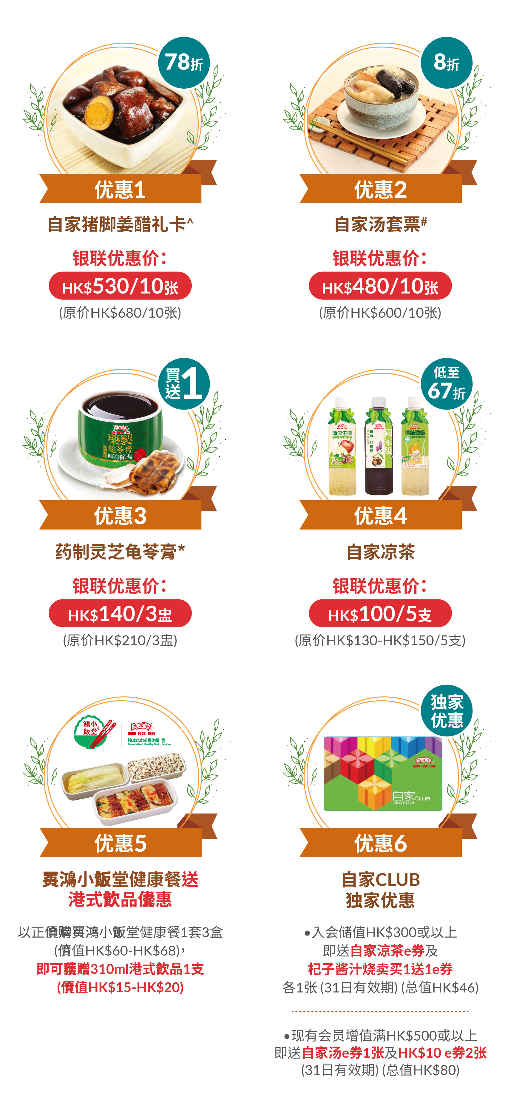 - 自家套票及自家CLUB会员卡优惠须受有关条款及细则约束,详情请参阅套票之使用条款及细则或致电鸿福堂顾客服务部热线2920 2206查询。