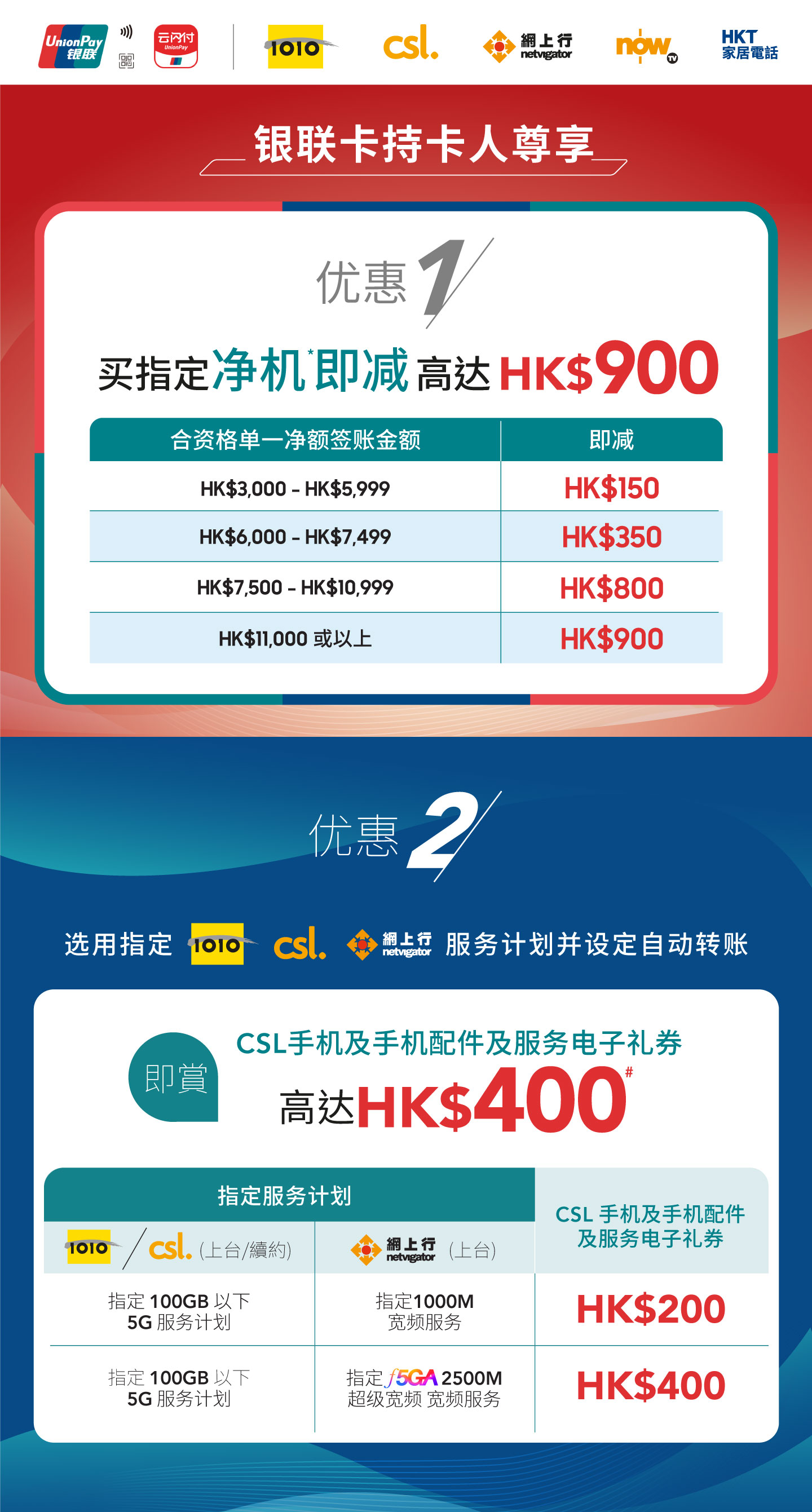 • 持卡人于推广期内于指定销售渠道以合资格银联卡上台或续约并签订含不少于 24 个月承诺期的指定1O1O / csl / Club Sim / 网上行宽频服务计划(「指定服务计划」)并设定自动转账,即可享高达HK$400 CSL手机及手机配件及服务电子礼券(「电子礼券」)下次使用。电子礼券将于 CSL 客户上台或续约指定服务计划或网上行客户上台指定服务计划起计一个月内,透过1O1O / csl / Club Sim应用程式或MyHKT应用程式发放。电子礼券条款及细则适用。详情请参阅 https://www.hkcsl.com/tc/hkt-unionpay-promo-2025sep-tnc/。