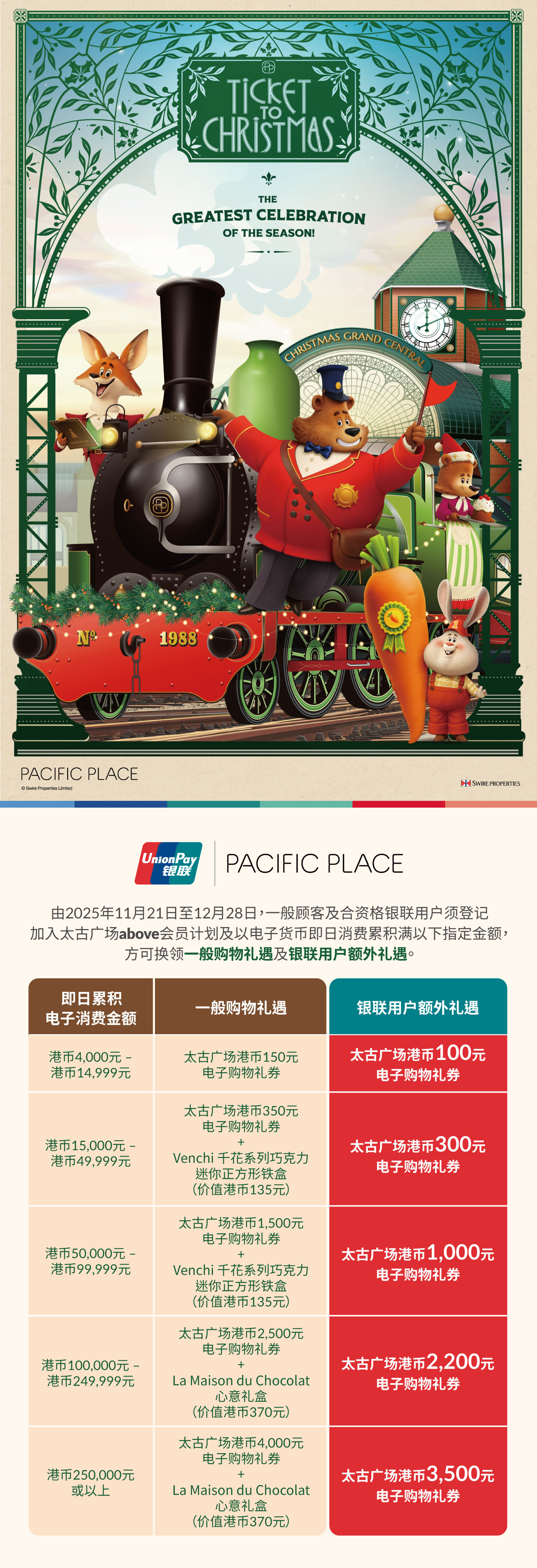 - 一般顾客及合资格银联用户(统称「顾客」)须登记加入太古广场above会员计划及以电子货币即日消费累积满以下指定金额,方可换领一般购物礼遇及银联用户额外礼遇(统称「礼遇」)。推广期内,银联用户最多只可换领银联用户额外礼遇10次。