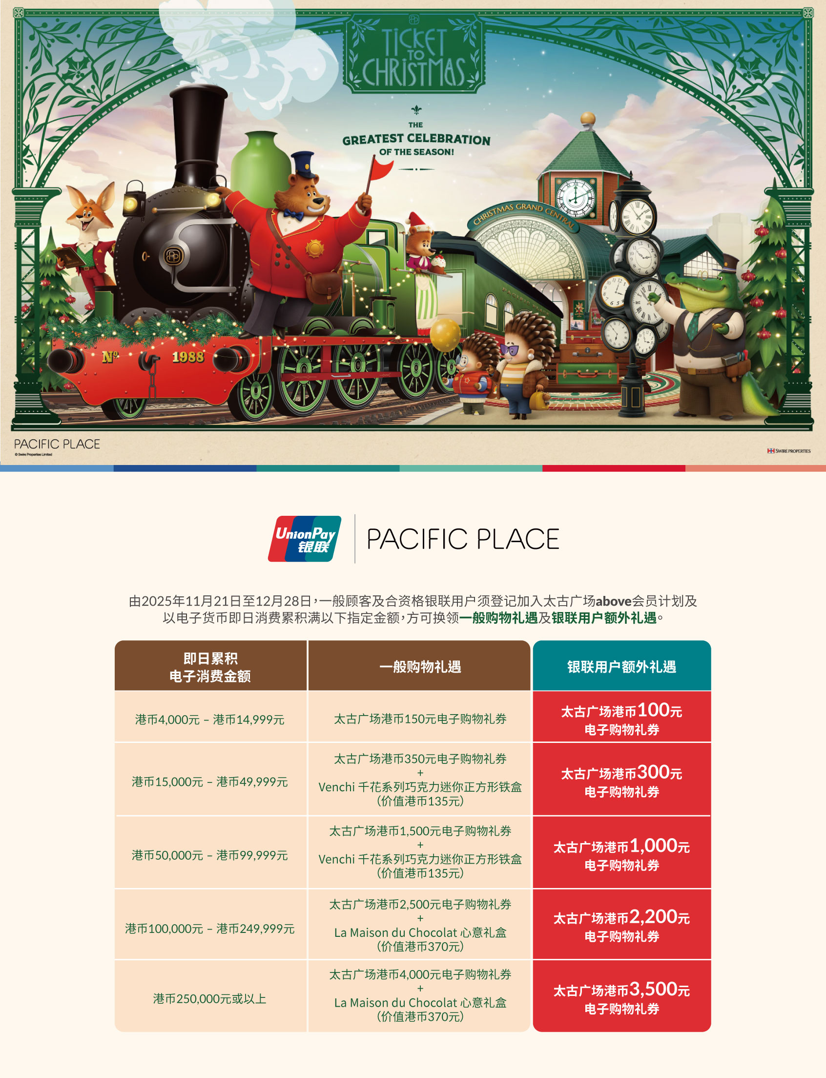 - 顾客必须于消费当日亲临圣诞礼品换领专柜(L1层,Theory附近),并出示太古广场/太古广场三座/太古广场六座/星街小区指定商户即日发出的电子消费收据及信用卡收据存根,方可换领礼遇。请参考以下连结之指定商户名单: https://www.pacificplace.com.hk/-/media/files/pacificplace2/pdf/PacificPlace-StarstreetPrecinct-designated-merchants