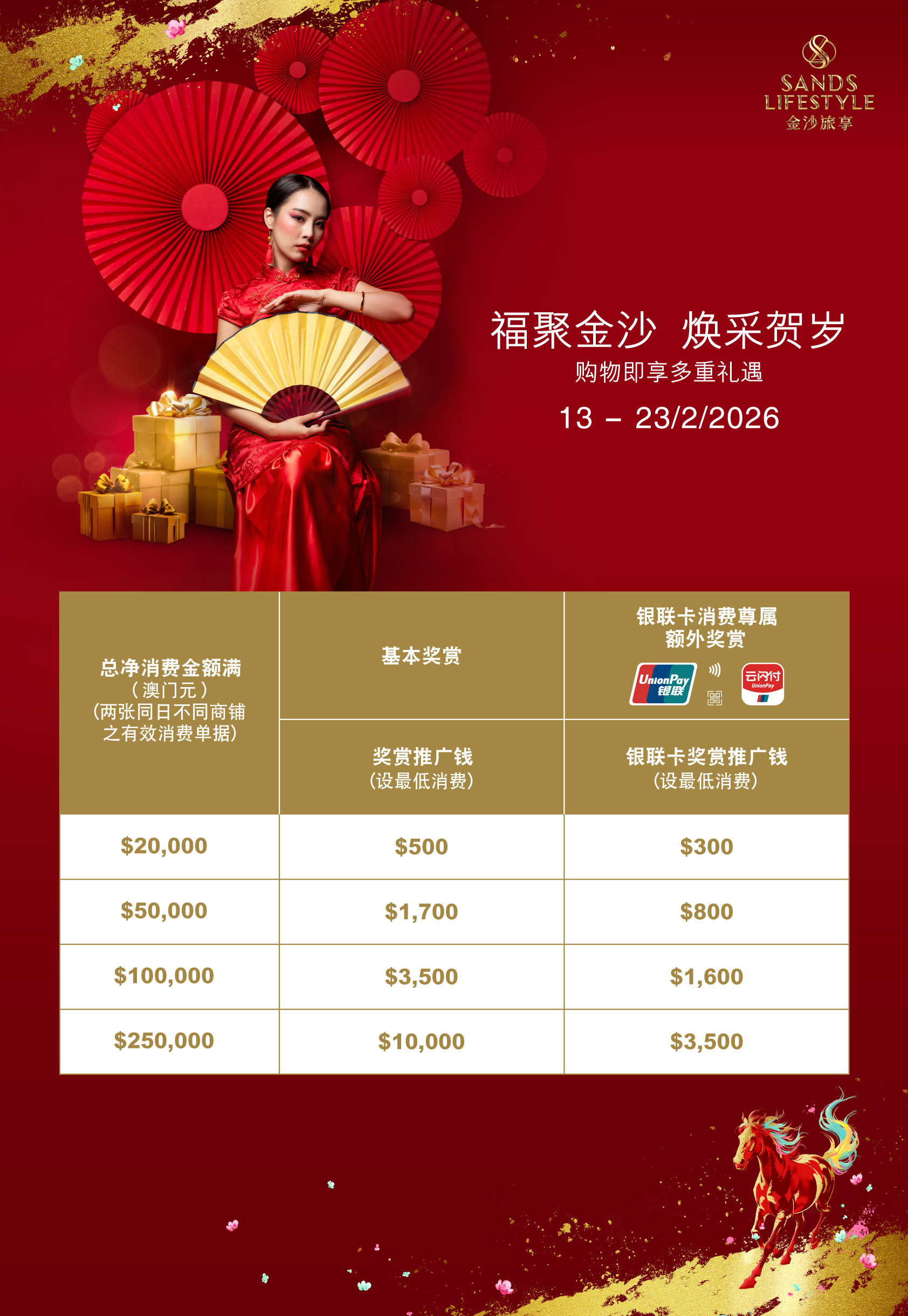 - 活动:此活动“福聚金沙 焕采贺岁”(以下简称“活动”)受以下条款及细则约束。