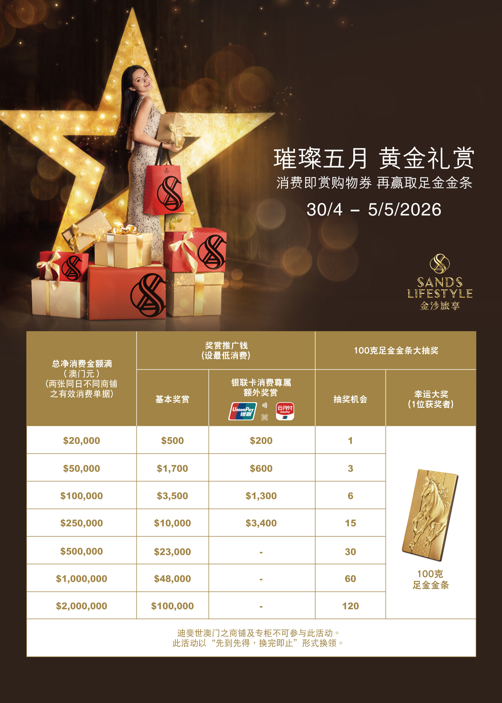 5.1 推广活动1:基本奖赏a. 根据此活动之条款及细则,顾客凡于活动期间同日于两间不同商铺消费累积满第5.1a条以下列表所述之总计净消费金额,即可换领适用于澳门金沙购物城邦的购物券 – 奖赏推广钱(以下简称“奖赏推广钱”)及获得参加「100克足金金条大抽奖」的抽奖资格(以下简称“抽奖机会”)(以下统称“基本奖赏”): 总计银联卡/银联移动支付净消费金额