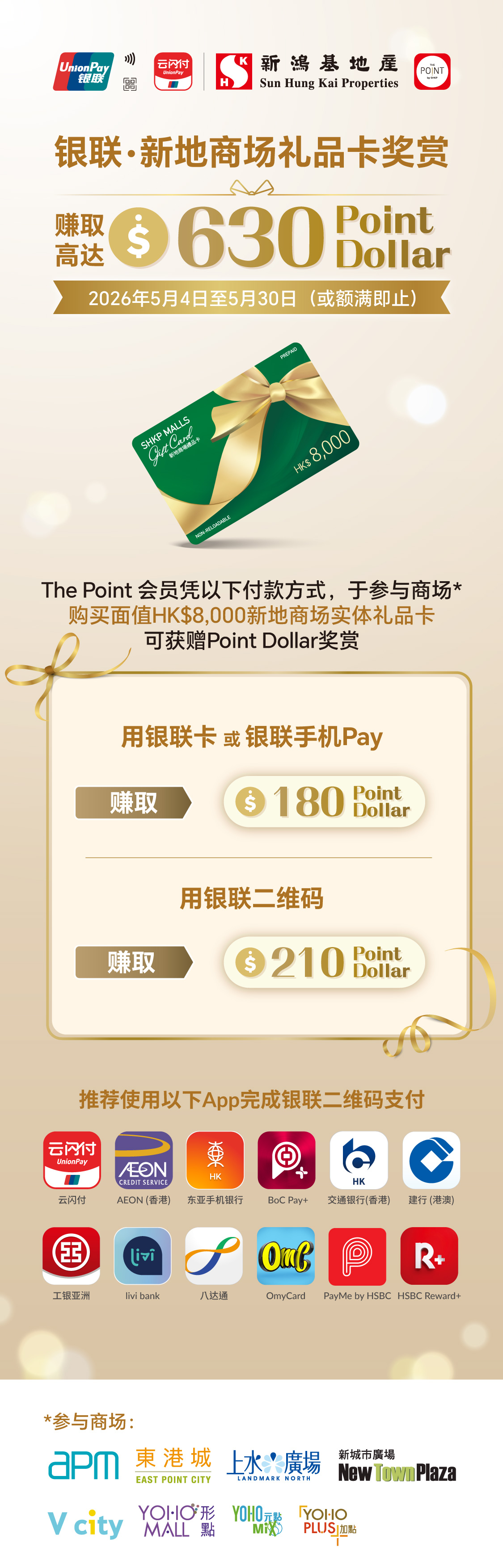 - 「银联 • 新地商场礼品卡推广活动」(「本活动」)的推广期为2026年5月4日至5月30日或额满即止(「推广期」)。本活动将于所有优惠名额换罄后即时终止,恕不另行通知。