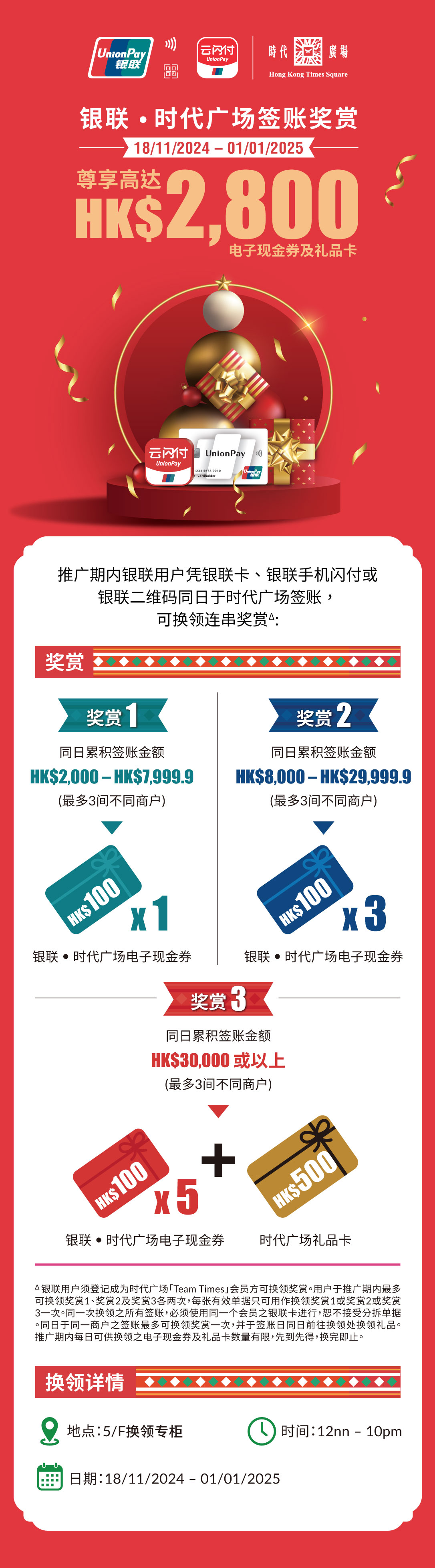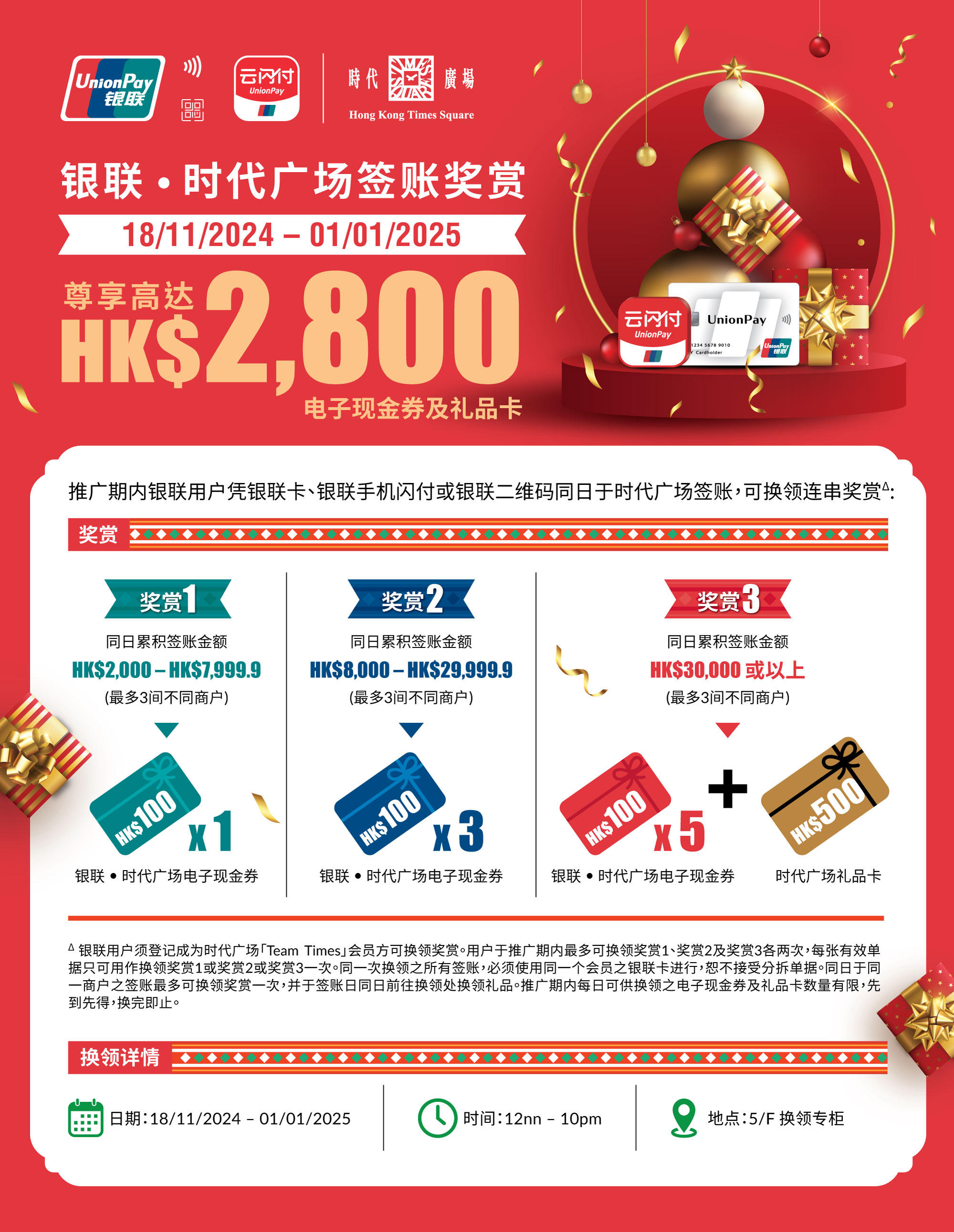- 「高达HK$2,800电子现金券及礼品卡」乃根据银联用户于推广期凭银联卡于时代广场任何商户签账满HK$2,000,换领HK$100银联 · 时代广场电子现金券一张两次(总值HK$200)、签账满HK$8,000,换领HK$100银联 · 时代广场电子现金券三张两次(总值HK$600) 、签账满HK$30,000,换领HK$500时代广场礼品卡一张及HK$100银联 · 时代广场电子现金券五张两次(总值HK$2,000)计算。