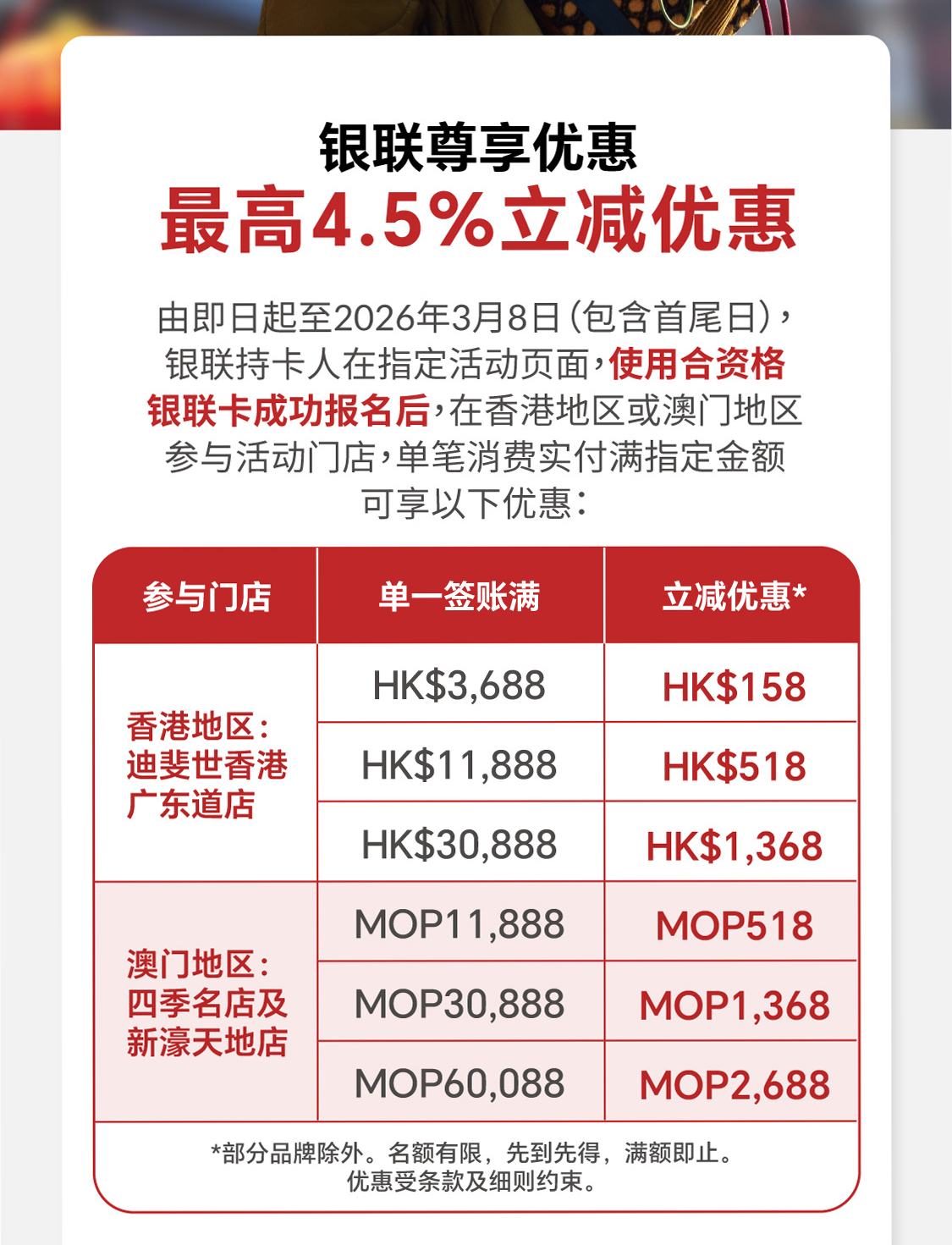*仅限经银联转接的消费交易参与活动,通过银联网银支付、第三方平台支付、未经银联转接的交易不参与活动,请咨询发卡行确认银行卡是否支持通过银联网络在该商户进行支付。 - 活动期间,每名用户最多可享受香港、澳门活动每个档位优惠各1次。符合同一设备,同一注册手机号,同一银行卡预留手机号,同一银行实体卡号,同一身份证号,均视为同一用户。每笔交易仅可享受其中一档优惠,单笔交易不可拆分支付,优惠不能提现。