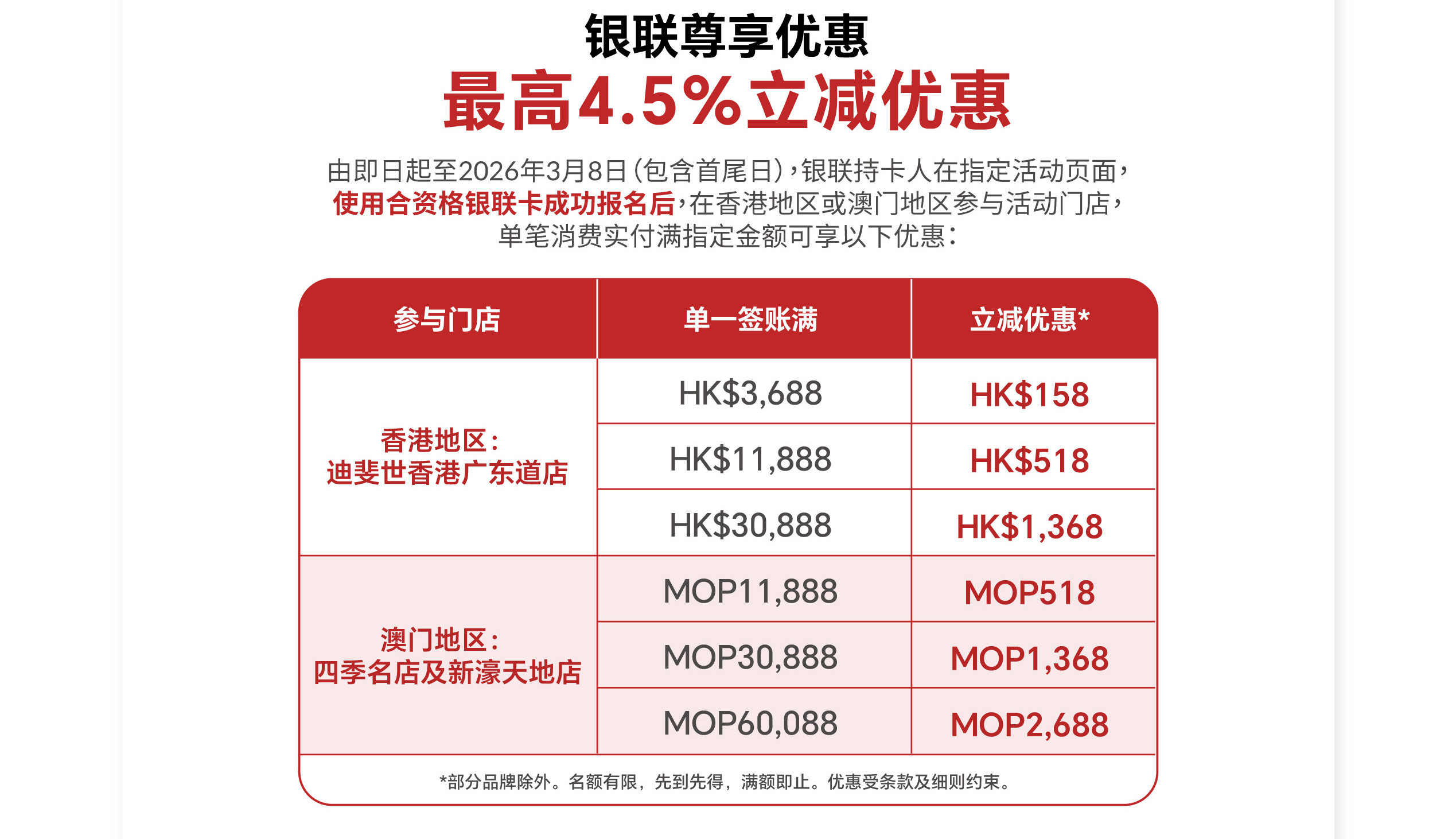 - 优惠使用可能受其他条款约束,活动详情以店内告知为准。实际店内可支持的银联支付方式以DFS店员告知为准。