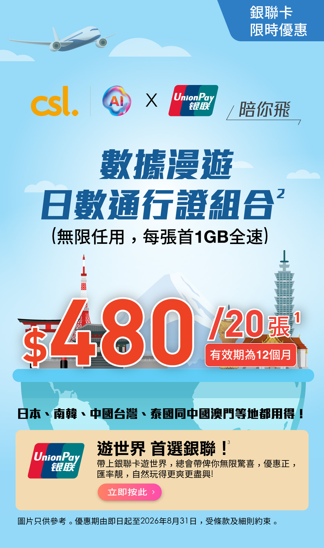 - 優惠只適用於持有由銀聯國際有限公司(「銀聯國際」)於香港所發行62字頭,卡面帶有銀聯標識的銀聯信用卡及提款卡(即 ATM 卡)、以銀聯手機Pay(包括但不限於 Apple Pay 及 Huawei Pay)或銀聯二維碼(包括雲閃付APP或其他支援銀聯二維碼的手機應用程式)(「合資格銀聯卡」)進行支付之持卡人(「持卡人」),惟香港指定發卡機構所發行之人民幣銀聯卡除外。持卡人必須使用銀聯卡通過銀聯網絡簽賬,方可享用優惠。其他付款方式如微信支付、WeChat Pay、支付寶、AlipayHK 恕不接受。客人必須於門市以合資格銀聯卡即時付款以享 $480「數據漫遊日數通行證組合 - 亞太精選 20 張」優惠。此優惠名額有限,並以先到先得的方式提供。優惠以香港身份證號碼計算,每個香港身份證號碼於優惠期內最多可以享用優惠5次。