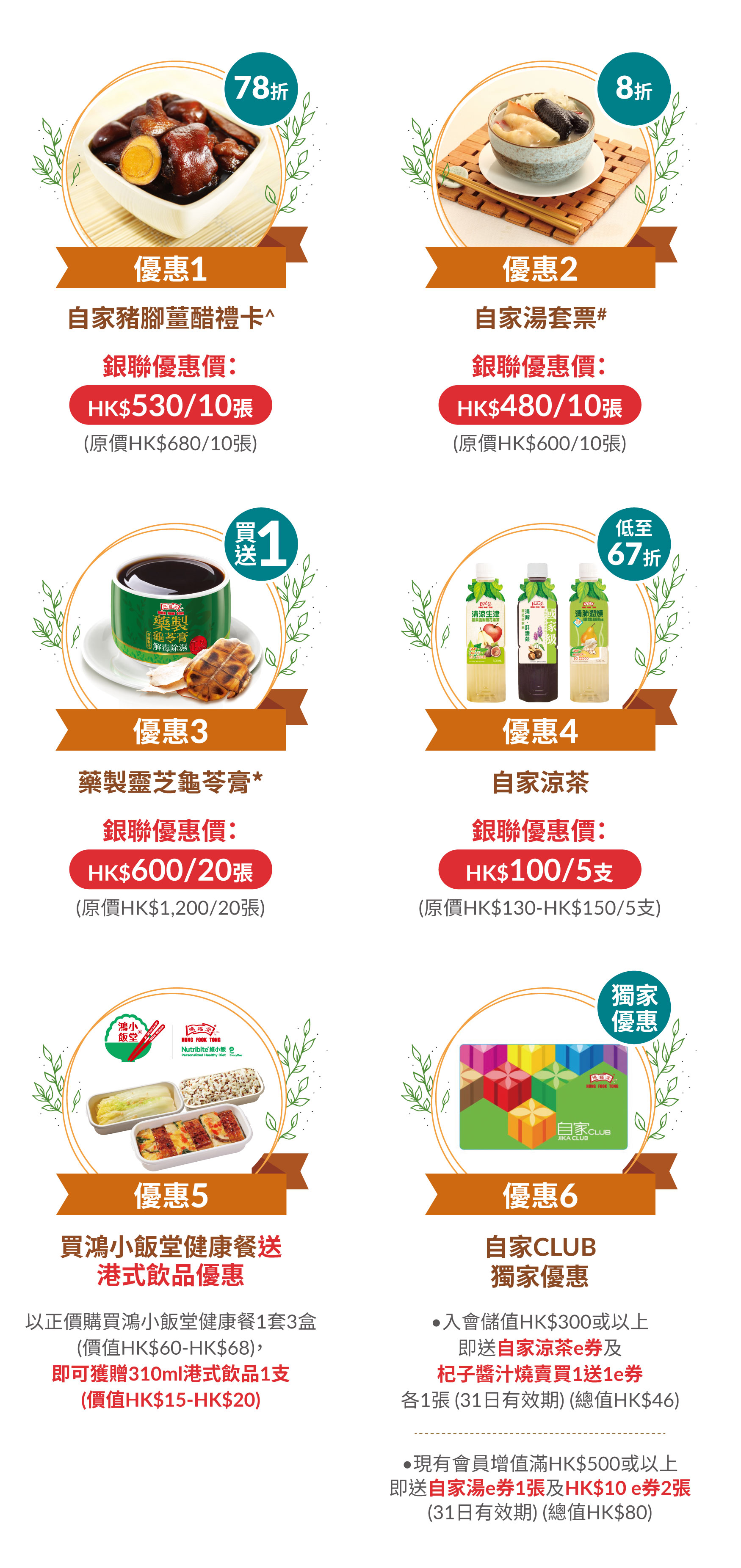 - 自家套票及自家CLUB會員卡優惠須受有關條款及細則約束,詳情請參閱套票之使用條款及細則或致電鴻福堂顧客服務部熱線2920 2206查詢。