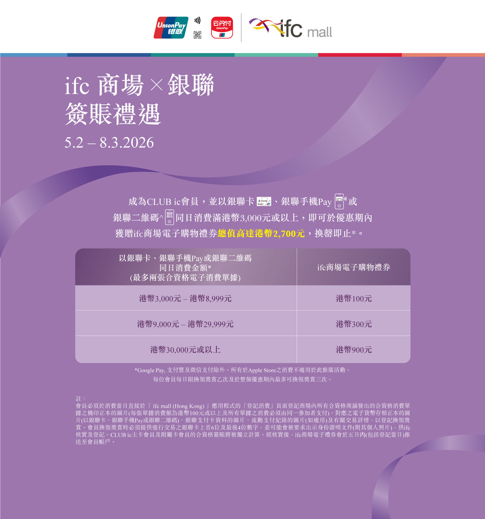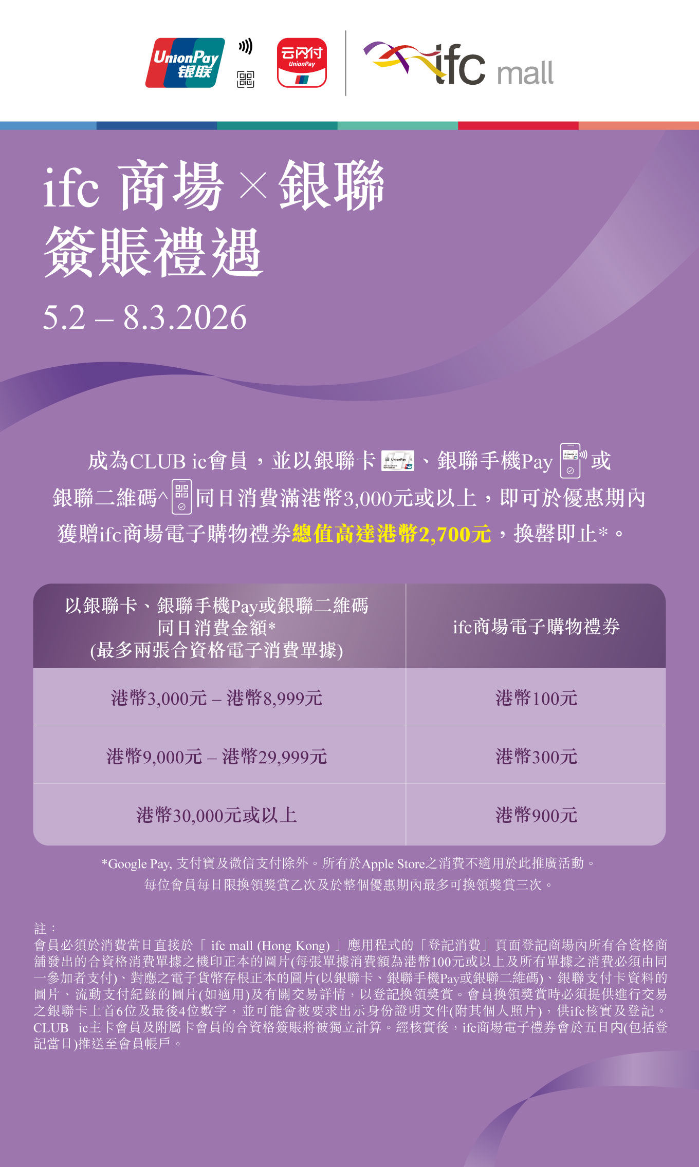 - 由2026年2月5日至3月8日或禮券換罄即止,參加者於商場內以銀聯卡、銀聯手機Pay或銀聯二維碼 (Google Pay, 支付寶及微信支付除外) 滿港幣3,000元或以上 (下稱“合資格消費”) (最多兩張來自不同商戶的即日消費單據,每次消費需達港幣100元或以上及所有單據之消費必須由同一參加者支付)*,但不包括所有現金消費、使用ifc Dollars、購買及使用現金券、禮品卡及購物禮券、Apple Store之消費、電訊服務、銀行及外幣找換服務、停車場、四季酒店、四季匯、預付信用額、可退還的按金、增值咭及增值服務的消費,並即日成功登記成為CLUB ic會員後可獲得ifc商場電子購物禮券 (下稱“ifc商場電子購物禮券”),詳情請見下表。