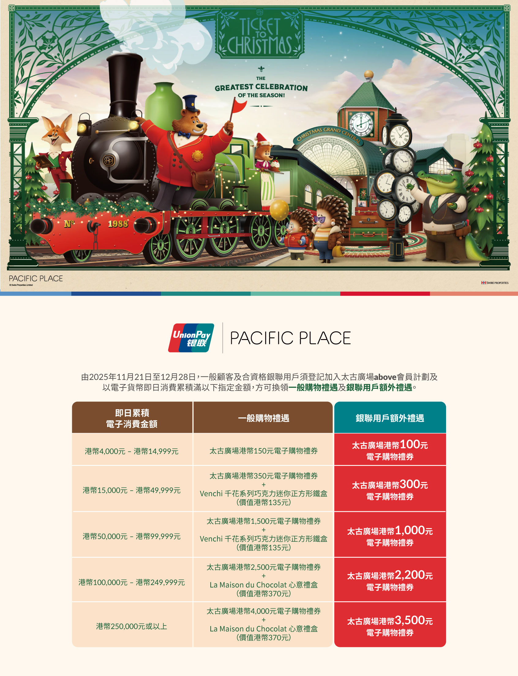 - 一般顧客及合資格銀聯用戶(統稱「顧客」)須登記加入太古廣場above會員計劃及以電子貨幣即日消費累積滿以下指定金額,方可換領一般購物禮遇及銀聯用戶額外禮遇(統稱「禮遇」)。推廣期內,銀聯用戶最多只可換領銀聯用戶額外禮遇10次。