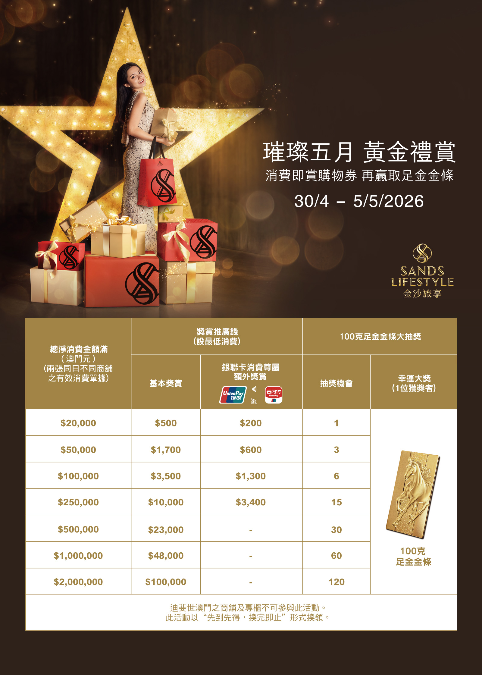 a. 獲發抽獎機會的顧客可於2026年5月12日當日或之前於金沙旅享會員帳戶內的「我的卡包 – 可使用」中查看本活動所得的抽獎機會次數。 b. 「100克足金金條大抽獎」共抽出一(1)位獲獎者,獲獎者將獲得100克足金金條一(1)條。抽獎時間表如下: