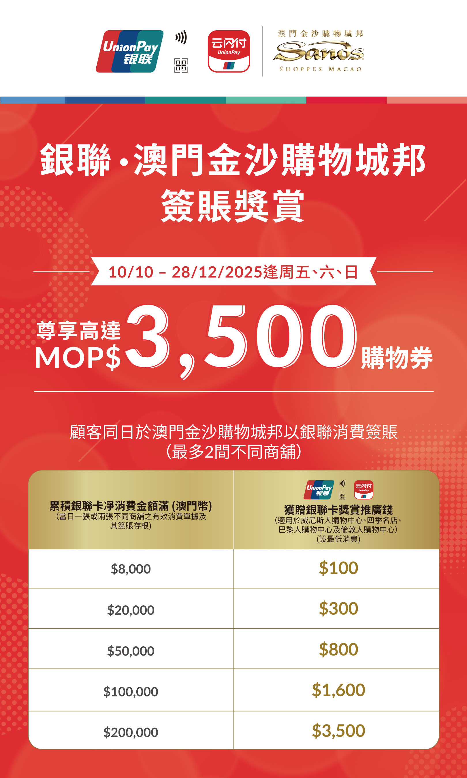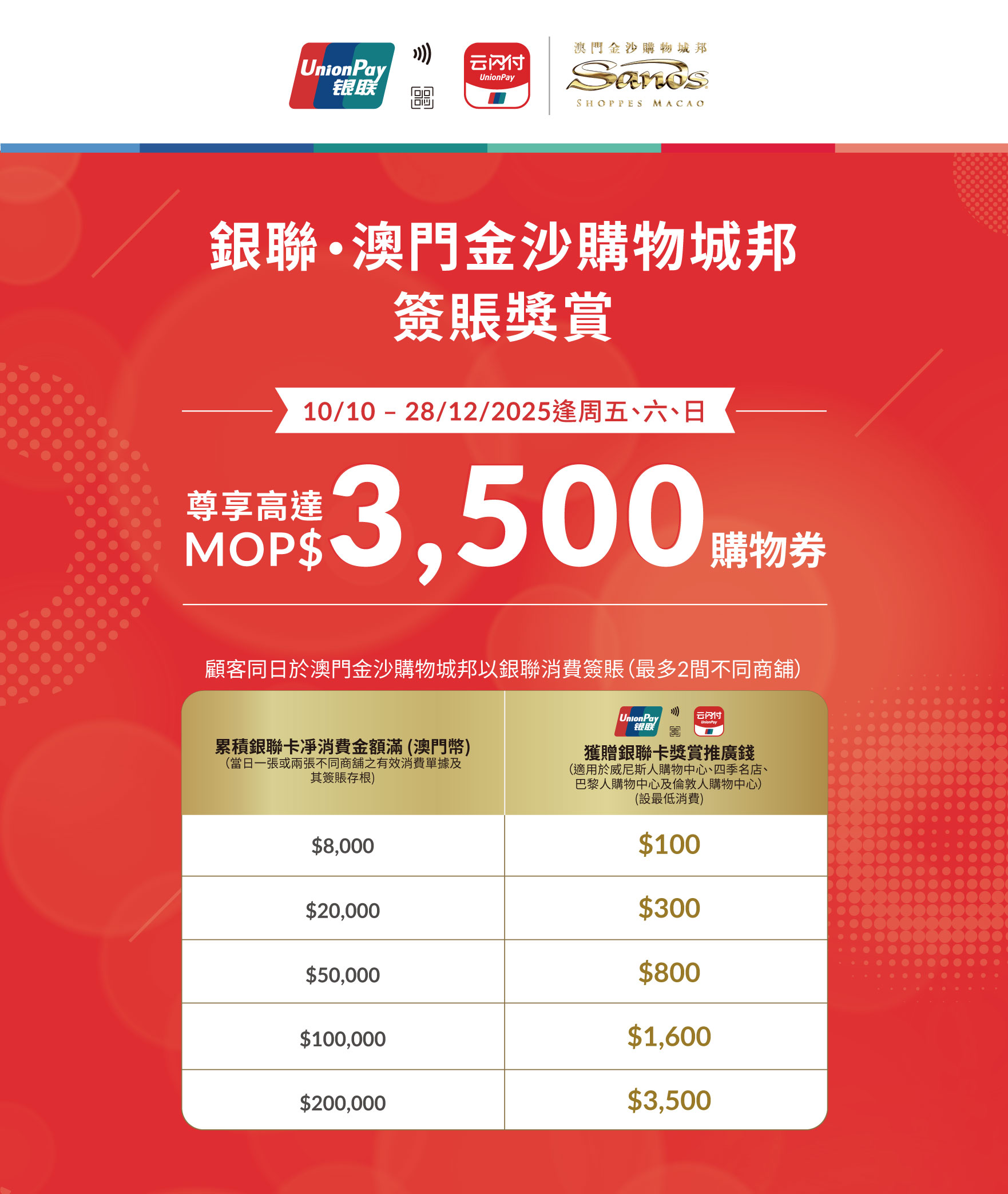 a. 顧客可使用由活動換領所得的獎賞推廣錢至2026年1月4日(“有效日期”)。不論基於任何原因,獎賞推廣錢之有效日期均不獲延期。 b. 獎賞推廣錢適用於任何金沙會參與商舖及專櫃(四季名店及倫敦人購物中心的路易威登除外),除非獎賞推廣錢上另有標示其他指定適用地點。 c. 顧客必須消費滿以下金額以使用獎賞推廣錢: • 每消費滿澳門幣300元方可使用價值澳門幣100元之獎賞推廣錢一張; • 每消費滿澳門幣1,500元方可使用價值澳門幣500元之獎賞推廣錢一張。 d. 如顧客於單次消費中使用多張印有最低消費金額要求之獎賞推廣錢時,消費總金額必須等於或高於所有獎賞推廣錢註明之最低消費金額的總和。 e. 如使用此活動中發行之獎賞推廣錢,顧客需以銀聯卡或銀聯移動支付通過銀聯網絡繳付尾款。有關獎賞推廣錢的附帶使用條款及細則,詳情請參閱該獎賞推廣錢的背面。 f. 獎賞推廣錢不可用作繳付酒店住宿費用。 g. 獎賞推廣錢不得被轉售、更換、退款或兌換成現金。如發現獎賞推廣錢被轉售,該等獎賞推廣錢即視為無效且不得使用,該等轉售獎賞推廣錢的顧客及通過直接或間接方式購入獎賞推廣錢的持票人應就所轉售的獎賞推廣錢對本公司產生或與之相關的任何直接或間接的損失、損害、成本、開支承擔連帶責任,包括但不限於向本公司賠償相當於所轉售獎賞推廣錢的總面值金額。本公司有權在發出通知或不發出通知的情況下,取消該等顧客及/或購入經轉售獎賞推廣錢的持票人參與本活動或本公司或其關聯公司未來的任何推廣活動之資格。本公司保留其在發出通知或不發出通知的情況下取消購入經轉售獎賞推廣錢的持票人參加本公司客戶獎賞計劃或其他獎勵資格的所有權利。 h. 任何獎賞推廣錢經損壞、更改、複制、手寫、偽造、水浸或以任何方式加以修改,或含任何電腦程序、印刷、機械、或排版錯誤,該獎賞推廣錢即屬無效且不得使用。 i. 此活動中發行之獎賞推廣錢可與其他金沙會發行之獎賞推廣錢同時使用並受各自之條款及細則約束。 - 個人資料: