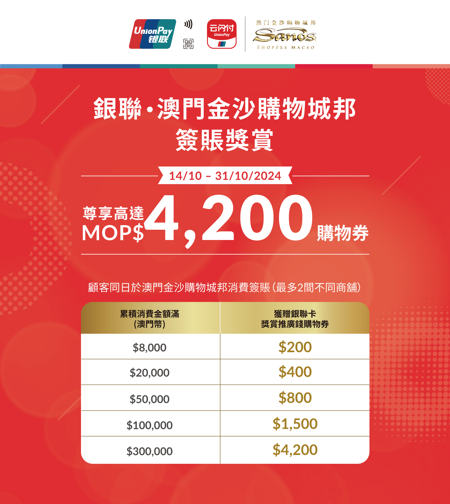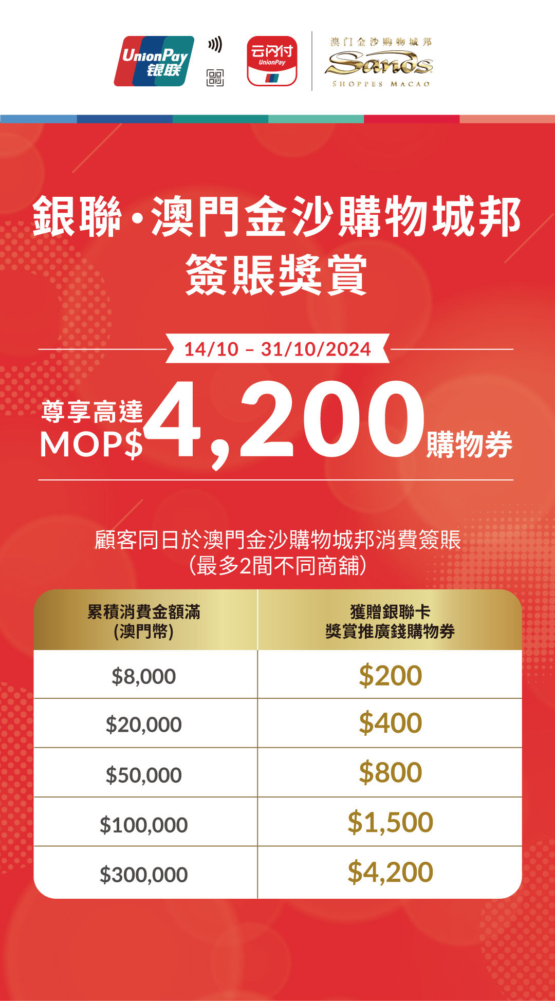 澳門幣100元獎賞推廣錢購物券兩張)b. 顧客需出示有效消費單據/商舖機印單據、相應之銀聯卡或透過銀聯移動支付的支付紀錄及其對應之簽賬存根正本以換領獎賞推廣錢購物券。 c. 用於換領推廣活動之有效消費單據/商舖機印單據上所示之消費金額與其對應之簽賬存根正本上之簽賬金額或銀聯移動支付紀錄必須為少於或等於有效消費單據/商舖機印單據上所示之消費金額。銀聯卡簽賬存根正本上之簽賬金額或銀聯移動支付紀錄須滿第5(a) 條列表所述之消費金額,方可獲贈獎賞推廣錢購物券。 d. 於同一有效消費單據/商舖機印單據上之所有銀聯卡或通過銀聯網絡之銀聯移動支付交易均視作來自同一張銀聯卡或同一銀聯移動支付交易。有效消費單據/商舖機印單據必須清晰列明商舖名稱、交易日期、消費金額及所購買之貨品,而銀聯卡簽賬存根正本或銀聯移動支付紀錄必須清楚列明銀聯卡卡號、商舖名稱、簽賬日期、簽賬金額、有效之授權號碼及持卡人簽署(如適用)。如顧客於換領時未能出示銀聯卡卡號、商戶名稱、交易日期、交易金額等資料相符之有效消費單據/商舖機印單據正本、持卡人簽賬存根正本或銀聯移動支付紀錄、有效之指定銀聯卡,或持卡人所提供之資料不全,不論基於任何原因,持卡人將不可換領獎賞推廣錢購物券。 e. 所有損毀、過期及未能清晰顯示交易日期、時間、交易金額、貨幣或並未列明卡號當中任何數字的銀聯卡簽賬存根正本或銀聯移動支付紀錄,以及商舖機印單據均不被接納。 f. 每位顧客於整個活動期間最多可參加換領回贈二十次。 g. 獎賞推廣錢購物券均以“先到先得,換完即止”形式換領。 h. 獎賞推廣錢購物券不可兌換現金或其他優惠。 i. 如獎賞推廣錢購物券遺失、被盜或損毀,恕不可獲補發及退款。 j. 是次活動不可與其他優惠同時換領。 - 於澳門金沙購物城邦消費: