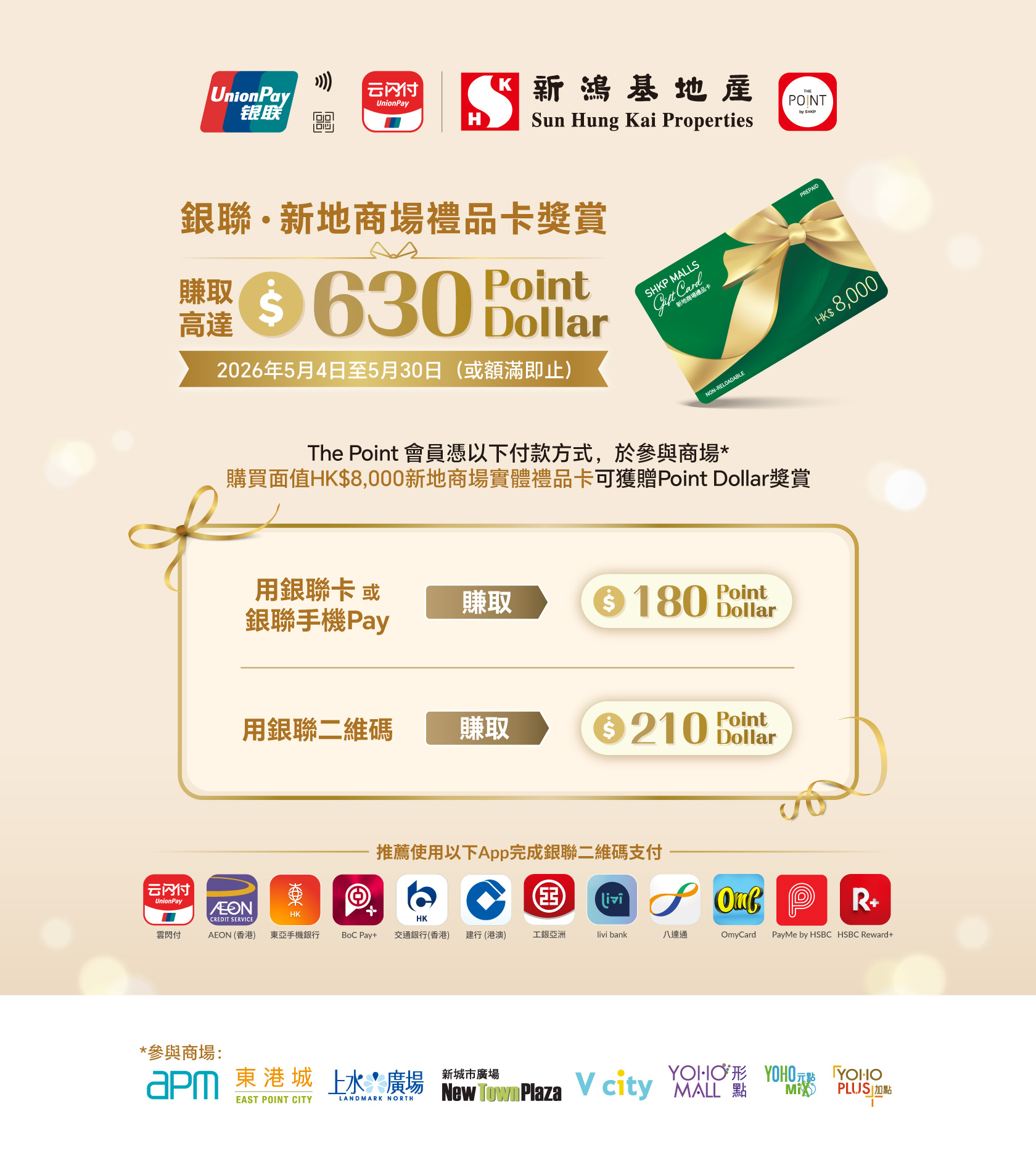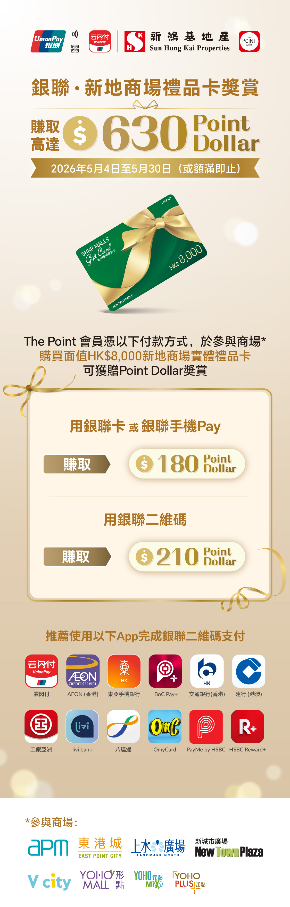 - 每位會員(以The Point會員編號計算)每日於同一參與商場只可換領優惠一次(不論支付方式)及整個推廣期內於所有參與商場合共最多換領優惠三次(不論支付方式)。惟每張銀聯卡(以卡號計算)於本活動最多只可用作購買HK$8,000新地商場實體禮品卡三次。