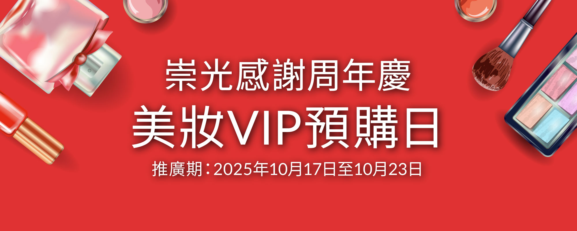 - 除非另有訂明,崇光感謝周年慶美妝VIP預購日適用於崇光銅鑼灣店及啟德店,推廣期由2025年10月17日至10月23日,包括首尾兩日(下稱「推廣期」)。