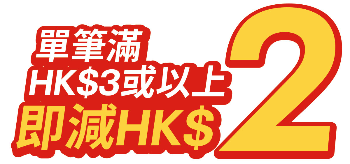 - 推廣期內的周五至周日,持卡人成功支付港鐵、九巴、龍運、城巴、城巴機場快線、嶼巴、專線小巴、香港電車、港九小輪、新渡輪及天星小輪的車/船費單筆滿港幣3元享立減港幣2元優惠 (下稱「優惠」)。