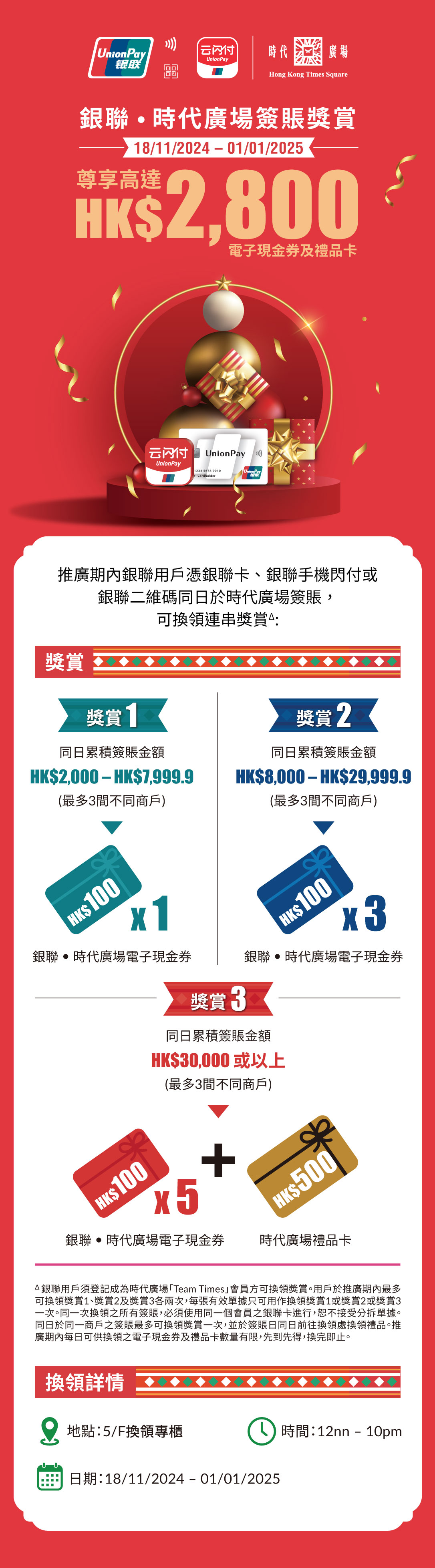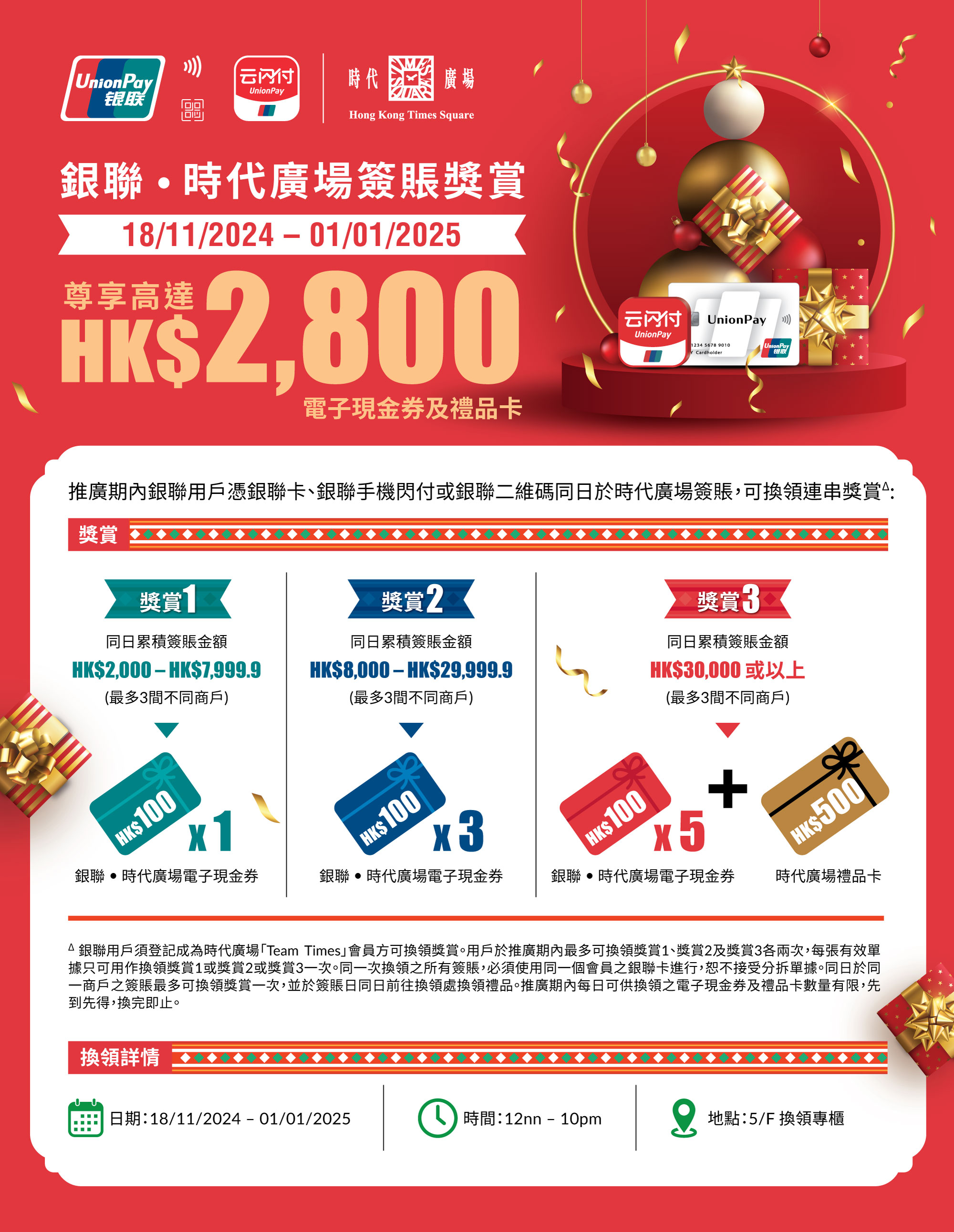 - 銀聯用戶於推廣期內憑銀聯卡於時代廣場任何商戶即日簽賬: