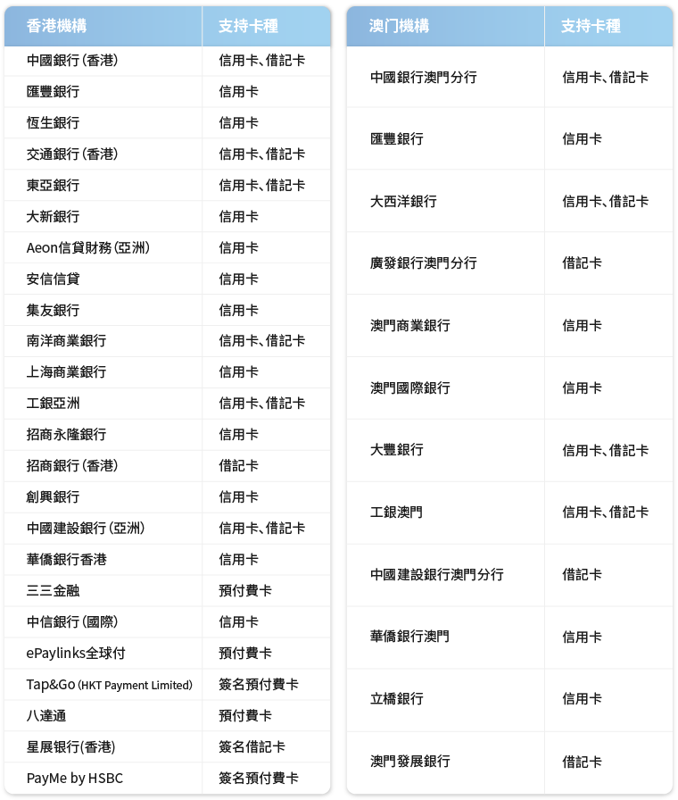 首階段,中國銀行(香港)、交通銀行(香港)、僑達國際、中國銀行澳門分行、大西洋銀行、廣發銀行澳門分行等6家機構支持所發行之銀聯卡綁定雲閃付App,這些機構的銀聯卡客戶可率先通過雲閃付App便捷地掃碼支付或網上支付。下一步,綁卡服務將進一步覆蓋港澳地區大部份銀行,惠及更多本地居民。對於商戶而言,銀聯二維碼支付提供「主掃」和「被掃」兩種模式,其中「主掃」模式的開通無需進行任何設備改造,商戶只需列印專用收款二維碼,即可讓消費者通過雲閃付App掃碼完成支付。小微商戶可借此更加安全、經濟、高效的方式受理移動支付,從而獲得更多商機。