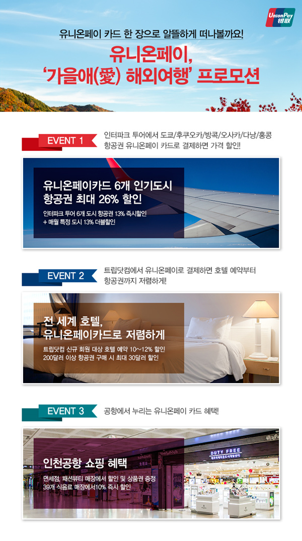 글로벌 카드 브랜드사 유니온페이 인터내셔날(동북아지역 총괄대표 박미령)은 추석과 10월의 황금 연휴를 앞두고 해외여행객이 증가할 것으로 예상되는 가운데 여행 비용을 절감할 수 있는 ‘가을애(愛) 해외여행’ 프로모션을 진행한다고 21일 밝혔다.